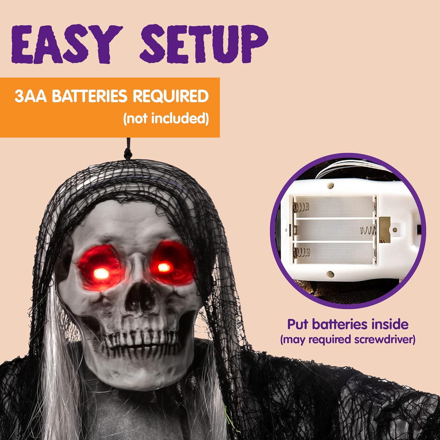SOUND EFFECTS DESIGN: Equipped with sound effects and shaking function design, you can use the voice control to make it shaking function and make a scary sound, which adds a great deal of fun for your guests. It is definitely scary at first glance, but it will surely provide hours of fun and entertainment for your visitors during trick-or-treat. 3 AA batteries required (NOT INCLUDED).