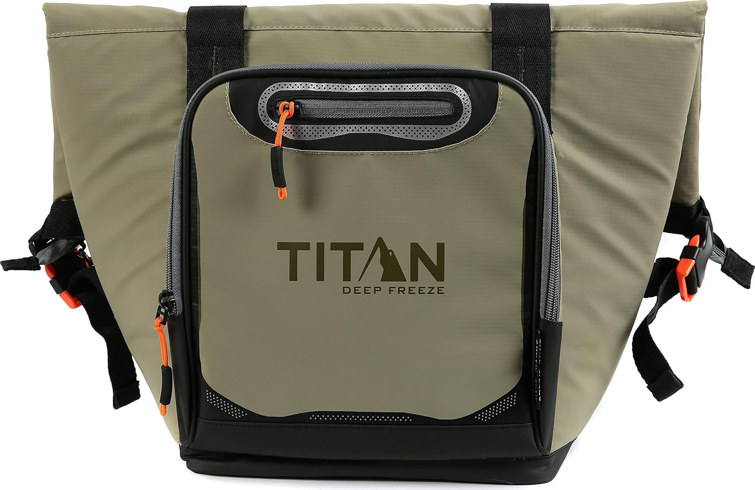 The Titan Deep Freeze Roll-Top Tote has a 12 can capacity and keeps ice up to 2 days. The tote’s versatile design allows you to roll and clip the top section when you’re packing smaller quantities or use it fully unfolded for extra capacity. Inside there is Deep Freeze high performance insulation with integrated radiant heat barrier and triple layer ColdBlock base for long lasting cold and an Ultra Safe leak proof* interior lining that is easy to clean and has Microban to help protect against odors and stains. The Rhino-Tech exterior is water and stain resistant and wipes clean easily. The exterior also includes an insulated front pocket and carry handles that can be slipped over the shoulder. *liquids may leak through the zipper