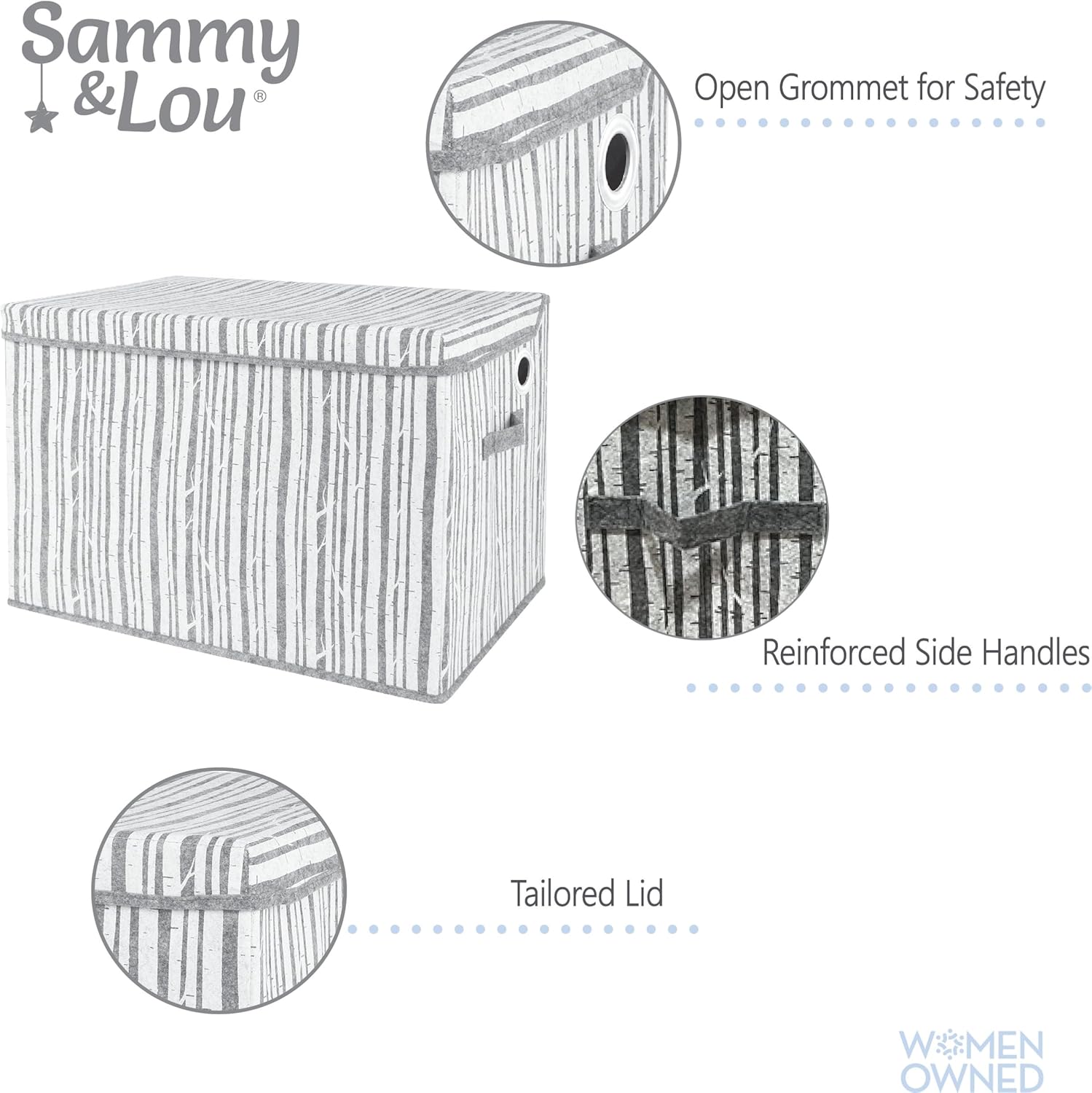 Our Birch Felt Toy Box is a great multi-purpose storage piece for any living space. Stash toys, books, blankets, clothes and keepsakes in this bin. The attached hinged lid features a tailored fold-over finish that brings an elevated elegance to this everyday storage bin. The toy box features white birch print design on the exterior and a solid gray inner lining. Coordinating accessories and room décor by Sammy and Lou are available and sold separately.