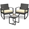 3 Pieces Porch Furniture Set Patio Rocking Bistro Set Outdoor Patio Chairs Rattan Conversation Sets with Coffee Table for Front Porch Garden Balcony Backyard Poolside (Beige Cushion)
