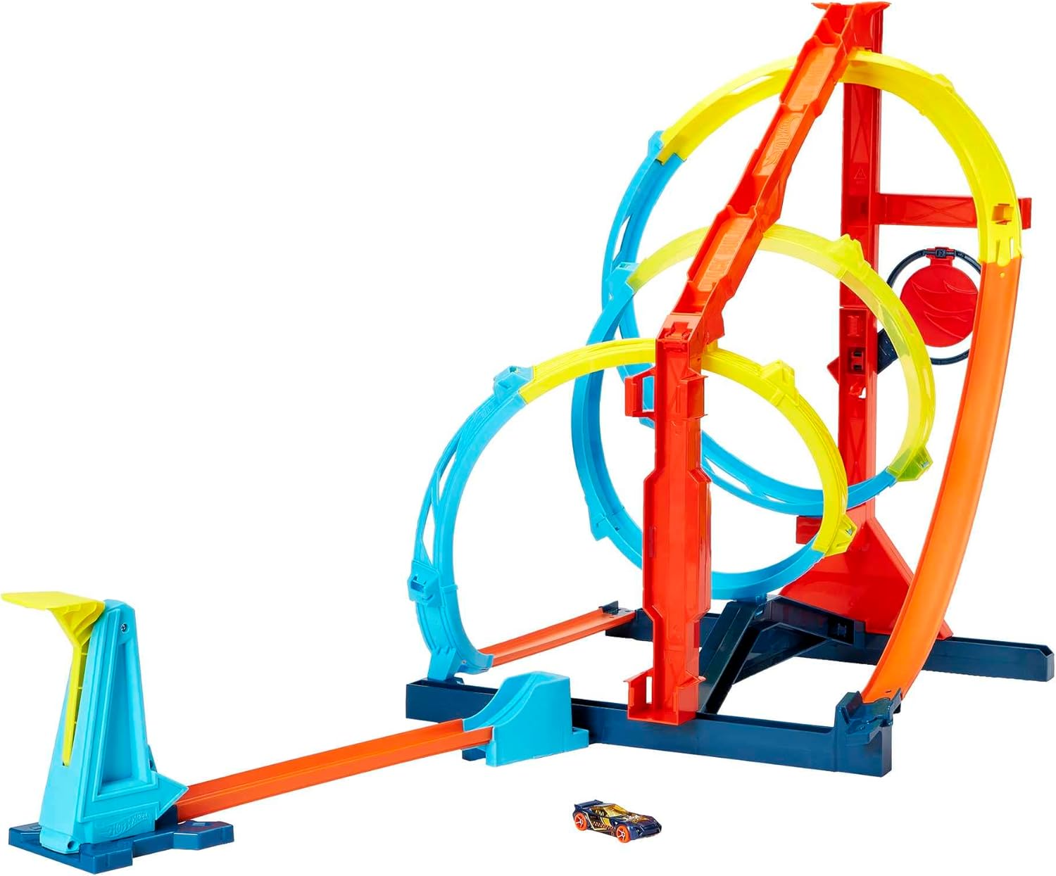 El Hot Wheels Track Builder Unlimited Corkscrew Twist Kit Playset hace que los autos salten a través de aros. Los niños lanzan sus Hot Wheels en 2 configuraciones posibles para saltar a través de un aro y golpear un objetivo.
