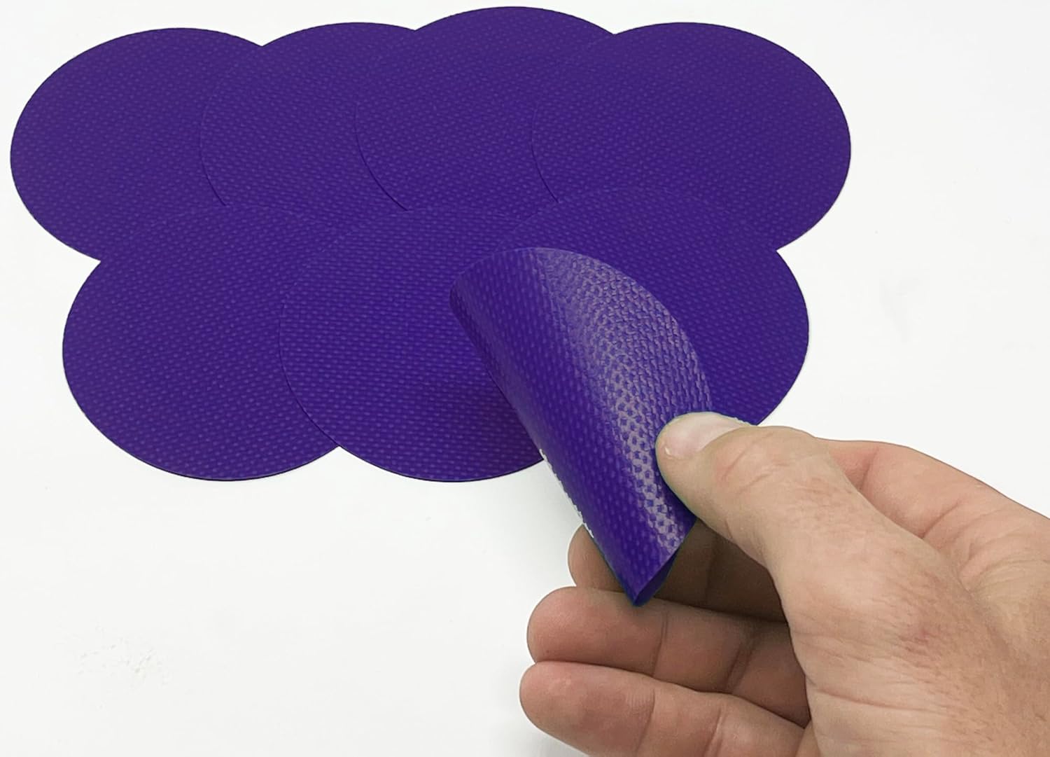 This vinyl repair kit from Pool Above includes eight (8) round heavy duty patches, each measuring 2 inches across. Constructed of 1100 denier polyester canvas fabric - extrusion-coated on both sides with waterproof, air proof flexible colored plastic for color-match and superior adhesion.
