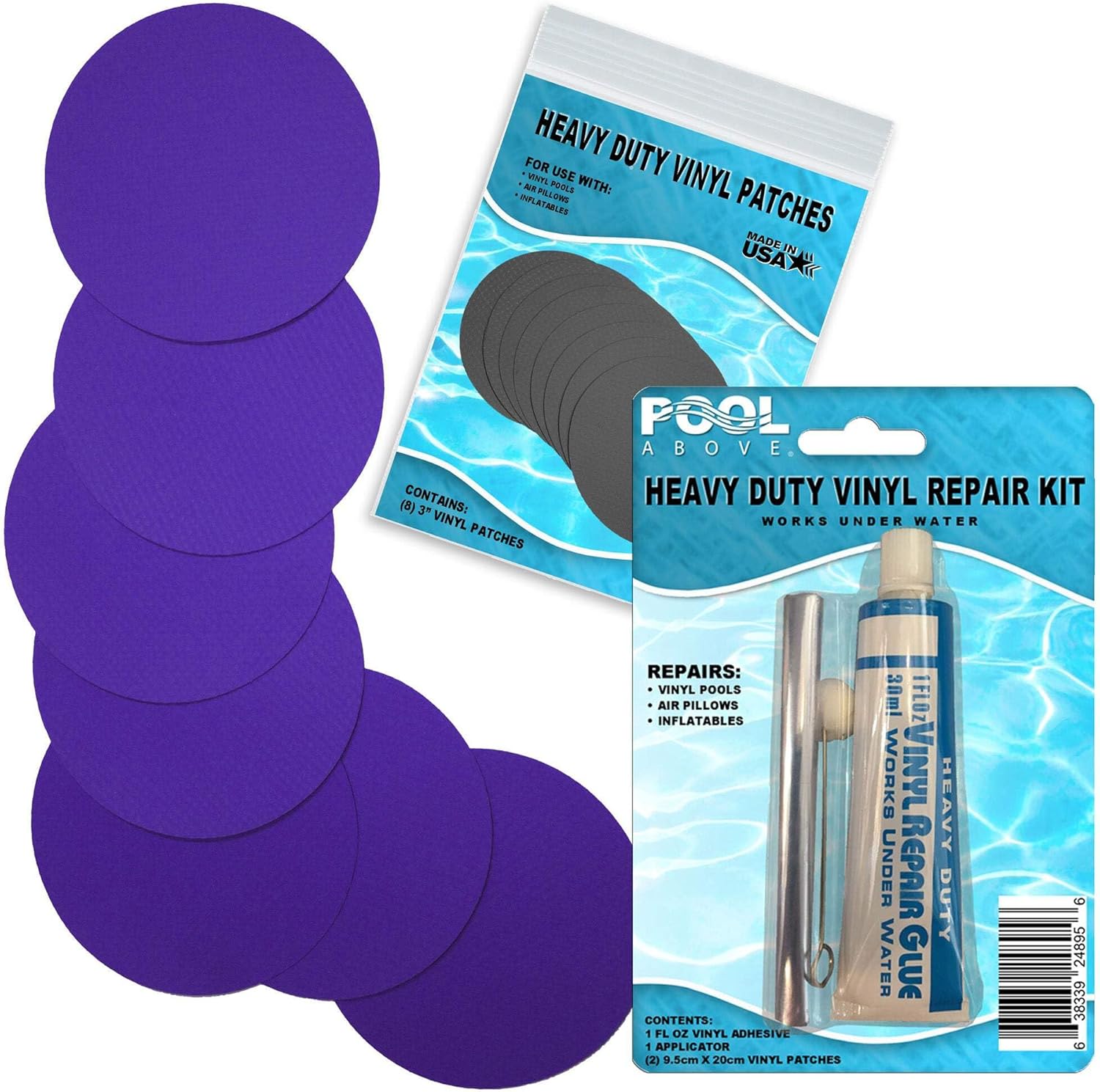 This Pool Above patch kit includes a glue kit and eight 3 inch heavy duty vinyl circles in your choice of color. The glue kit includes two complimentary 9.5cm x 20cm clear vinyl sheets along with 1 fl oz. (30ml) tube of vinyl cement and applicator. Please follow the instructions and watch the video for the best possible hold. Recommended age 14+ Application instructions: Clean all surfaces to be patched thoroughly using a vinyl surface cleaner. Cut the patch larger than the area to be patched. Cut the patch with rounded corners to prevent peeling. Light gauge vinyl & inflatable pools: Apply the adhesive sparingly to patch, covering it evenly all over. Heavy gauge vinyl & pool liners: Apply the adhesive liberally to patch, covering it evenly all over. Out of the water: Apply patch to cover damaged area being sure to press out all air bubbles. If possible, apply weight to the patch and allow 24 hours to reach full bond strength. Under water: keep patch folded onto itself over the area to be repaired, then unfold patch and apply immediately. Carefully press out all air bubbles. If possible, apply weight to the patch and allow 24 hours to reach full bond strength.Tip: If your damaged area is on a seam, add an additional bead of glue to the seam before applying the patch.