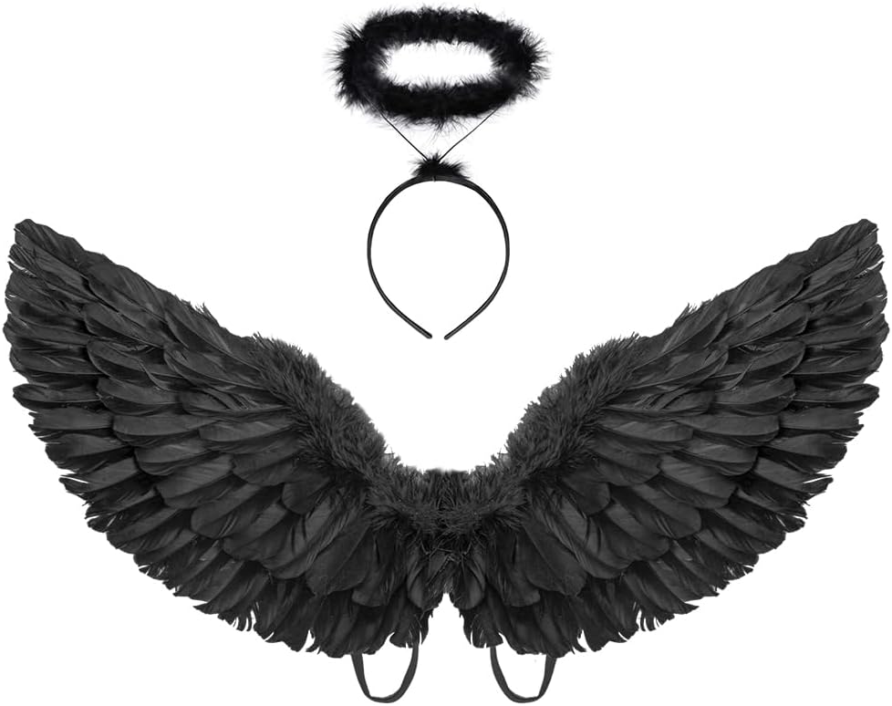 DVGUN Dark Angel Costume Wings and Halo for Kids fallen Angel Adult Feather Wings(Black)