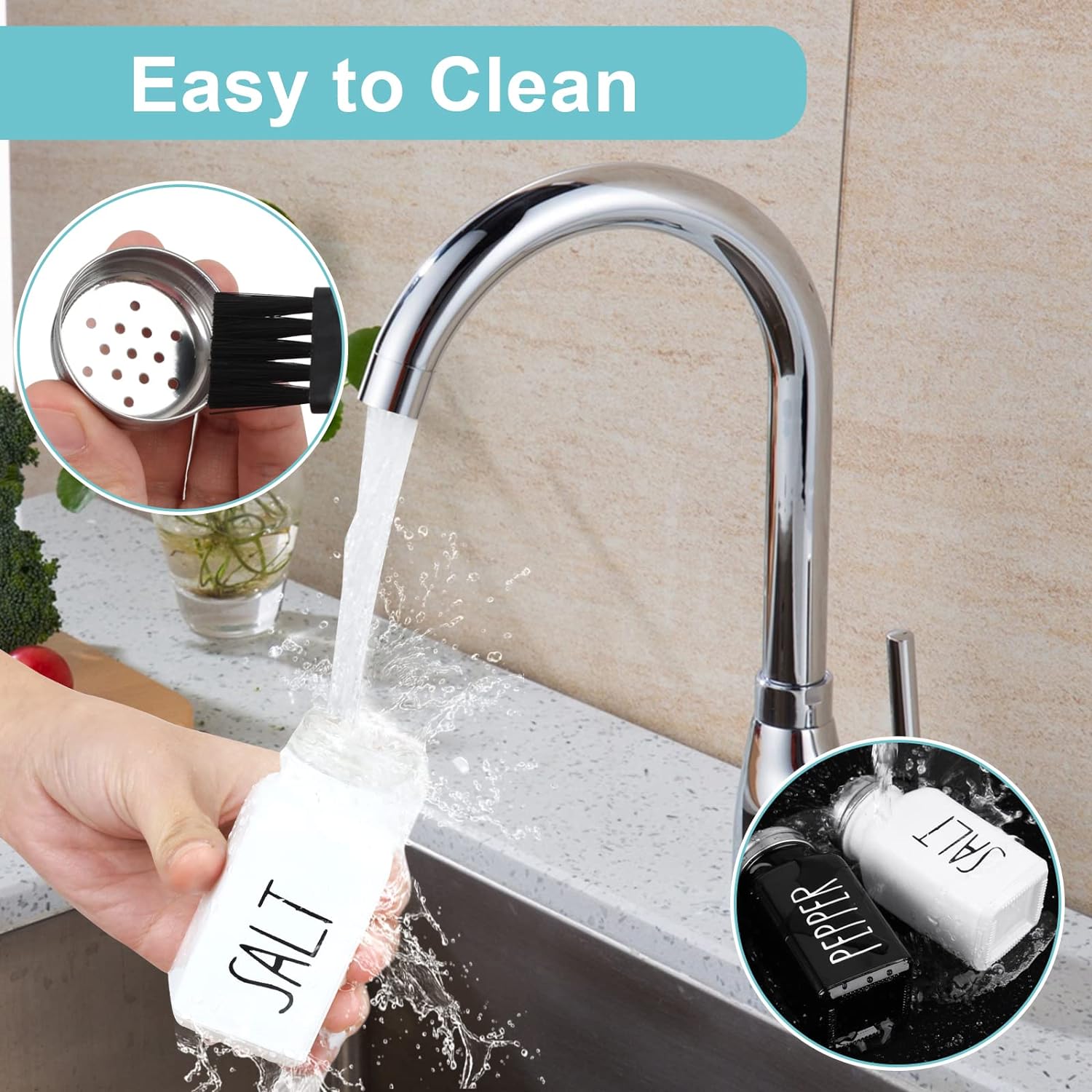 Easy to Clean: Salt and pepper shakers can be cleaned and rinsed quickly and easily by unscrewing their stainless steel caps. The inside of the bottle can be cleaned with a small brush. Please note that this salt and pepper shaker can only be washed by hand, not by dishwasher.