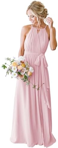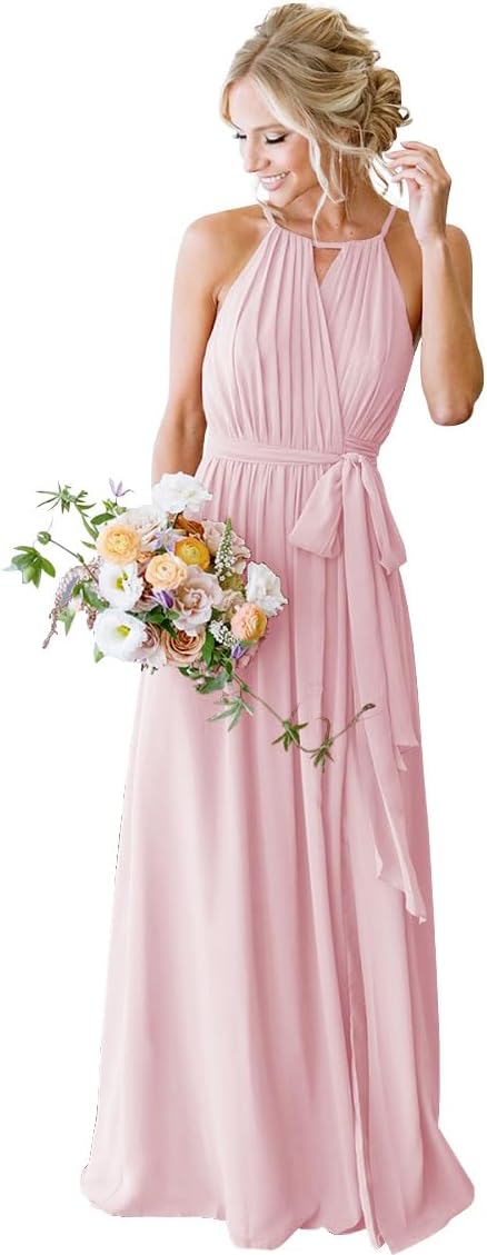 Vestidos de dama de honor Stylefun de chifón halter para mujer, largos, de línea A, vestidos formales simples plisados CYM032