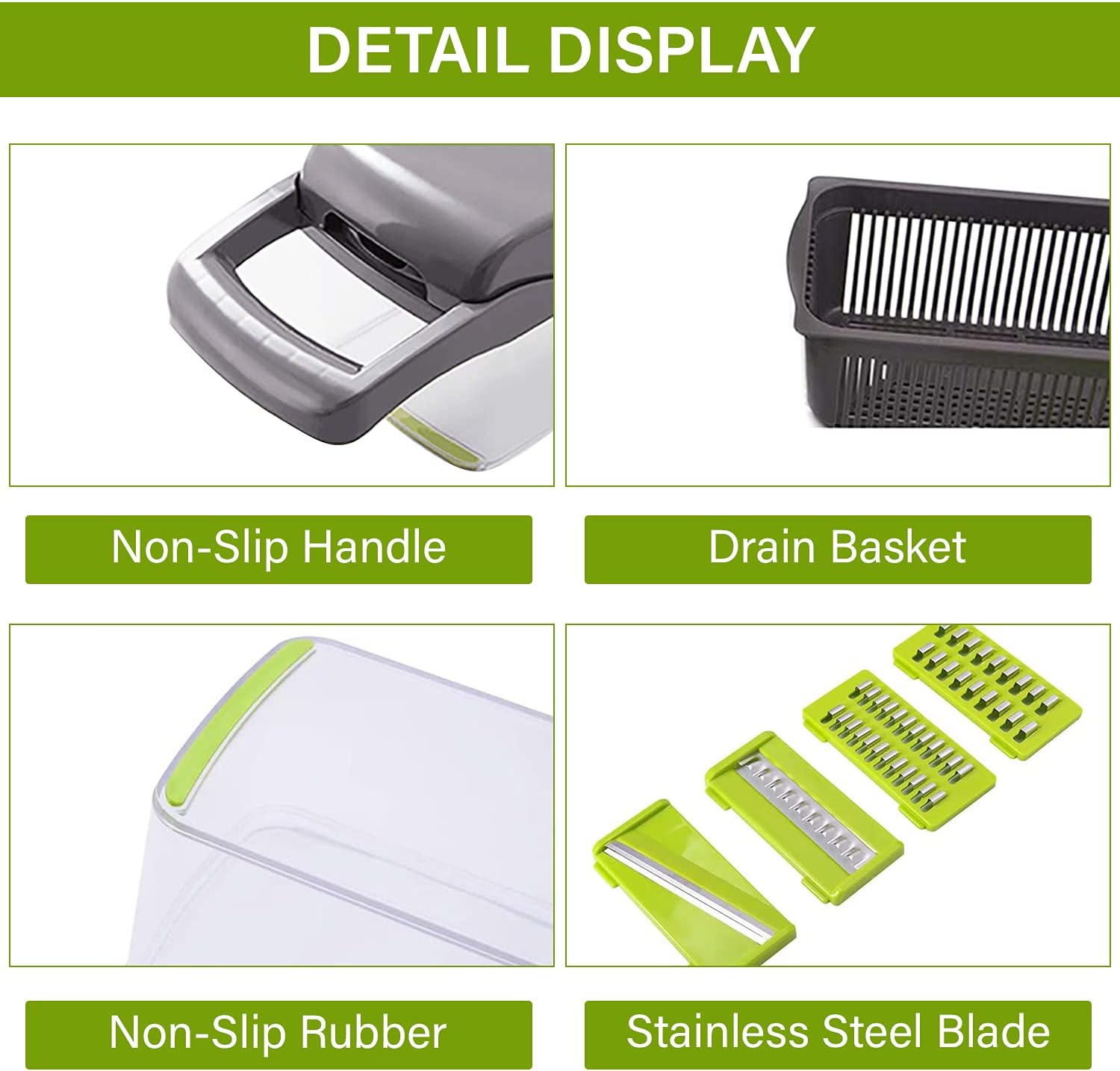 ✔ PREMIUM STAINLESS STEEL & MATERIALS - Our Vegetable Cutter blades are 304 Stainless Steel Blades making them Rust and Corrosion Resistant, with a BPA FREE food-grade plastic container to catch your fresh fruits and vegetables, and also has a rubberized non-slip base ensure stability and safety