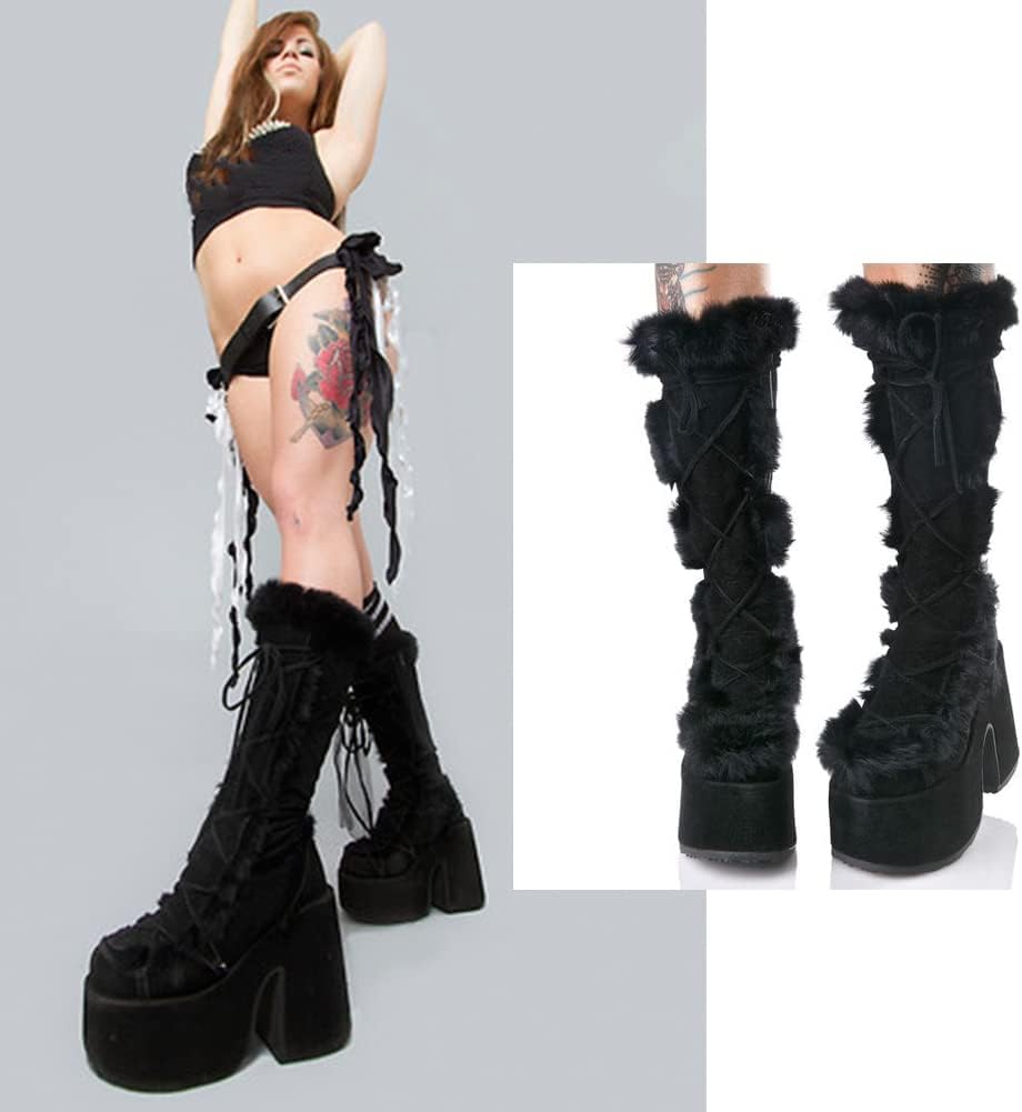 VIMISAOI Womens Mid Calf Boots, Lace Up Zip Block Chunky High Heel Punk Goth Warm Fur Winter Snow Platform Boots