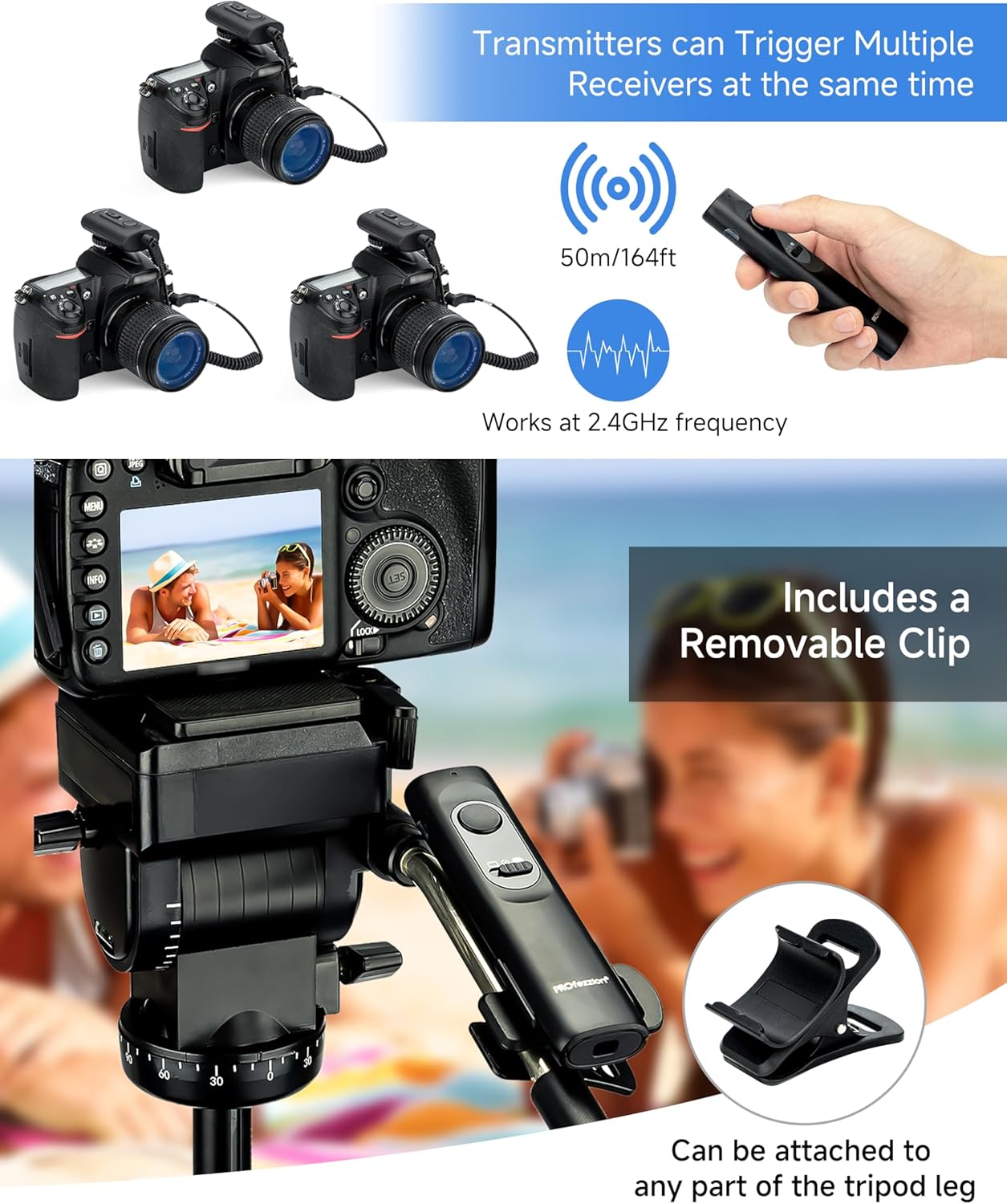 [2.4GHz frequency & 16 channels]- This series remote control works at 2.4GHz frequency and has 16 available channels. It reduces camera shake and allows you to take pictures of subjects that are difficult to approach