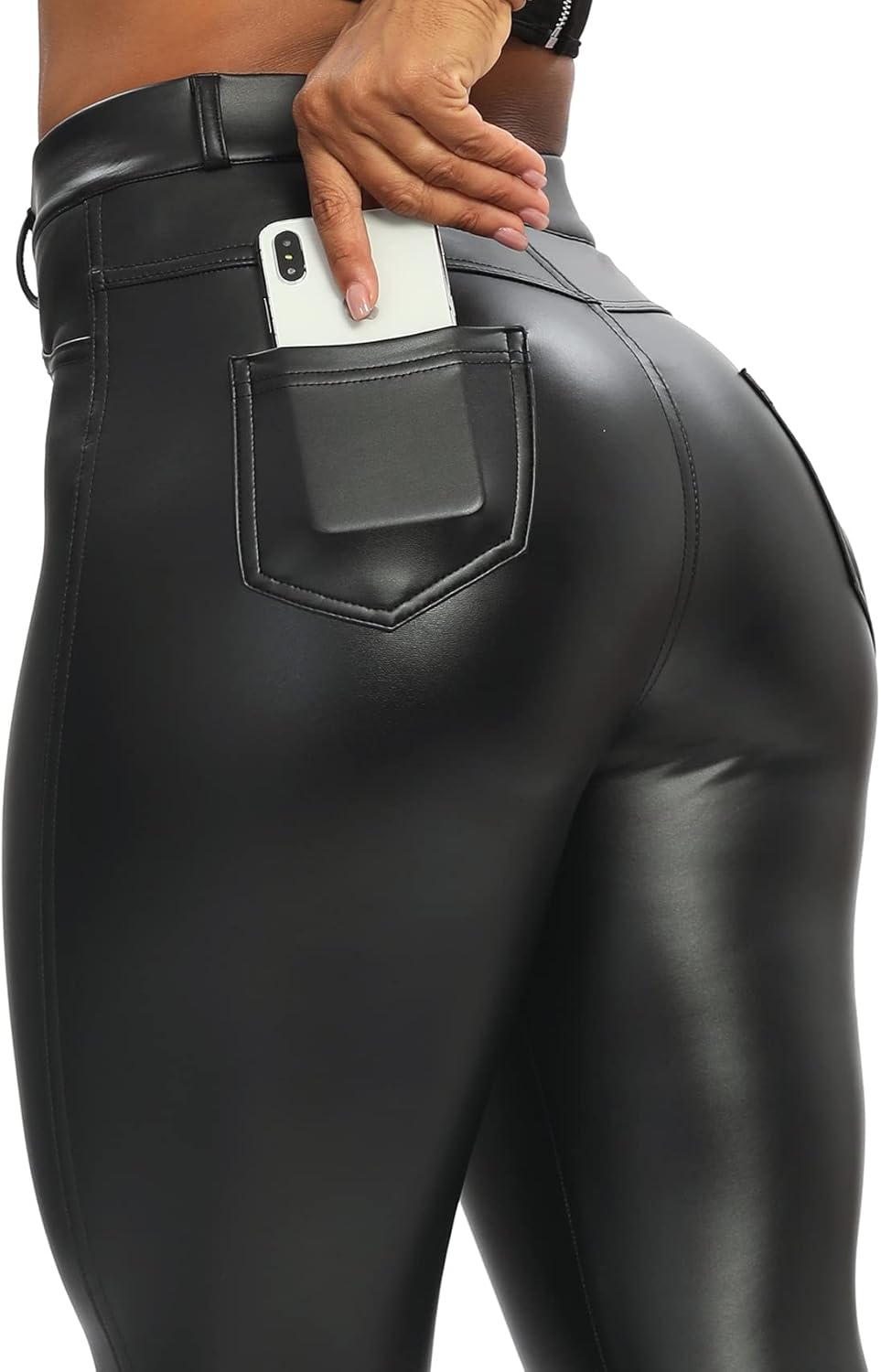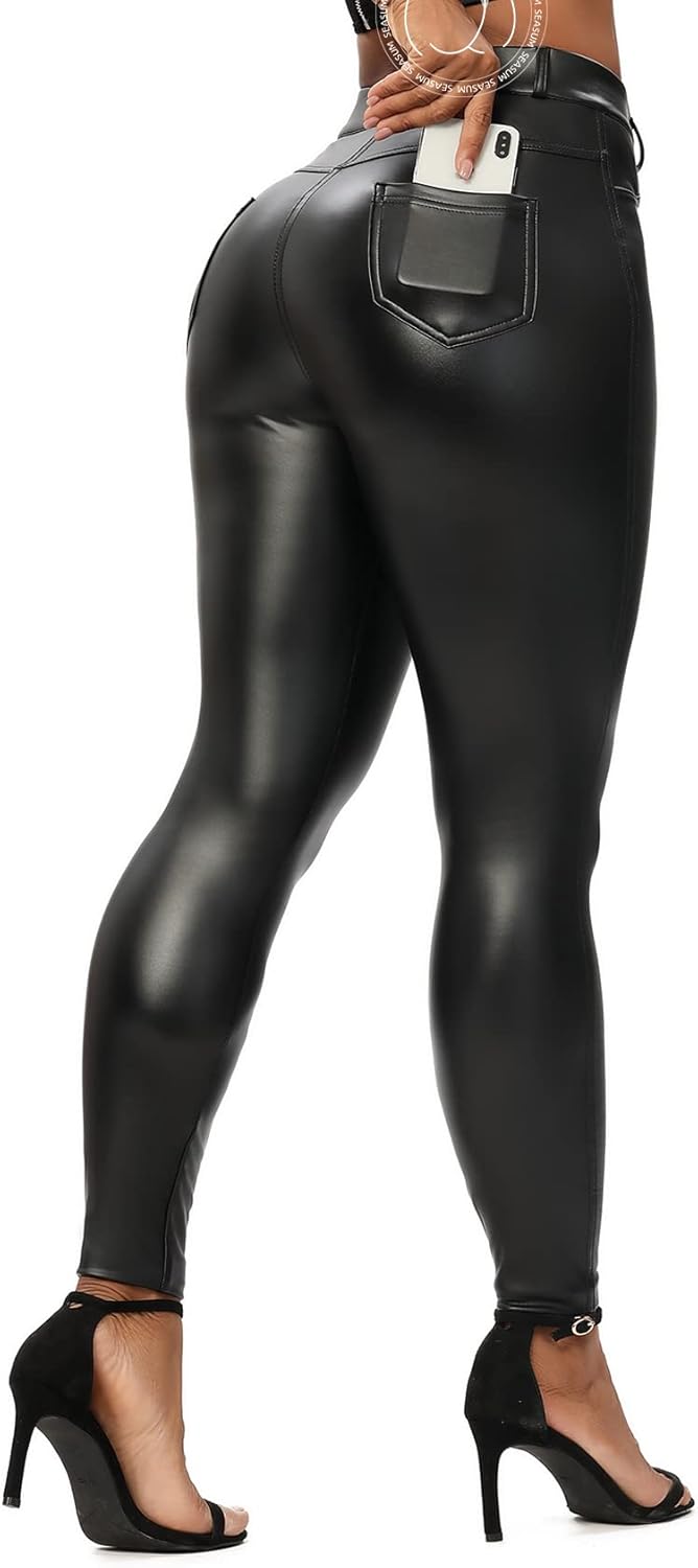 SEASUM Women's Faux Leather Leggings Pants PU Elastic Shaping Hip Push Up Black Sexy Stretchy High Waisted Tights