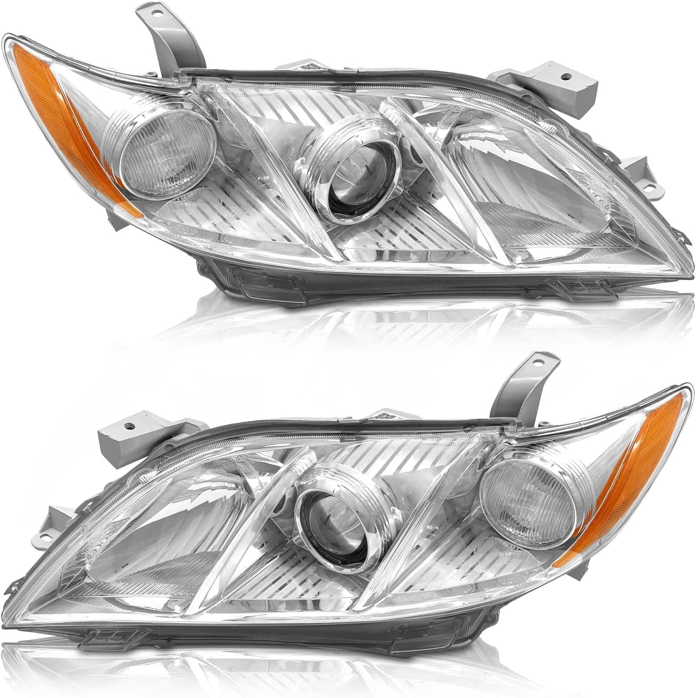 AS 2007 2008 2009 Toyota Camry Headlight Assembly Headlamps for 07 08 09 Camry Exclude Hybrid Projector Left and Right Pair - Chrome Housing Clear Lens