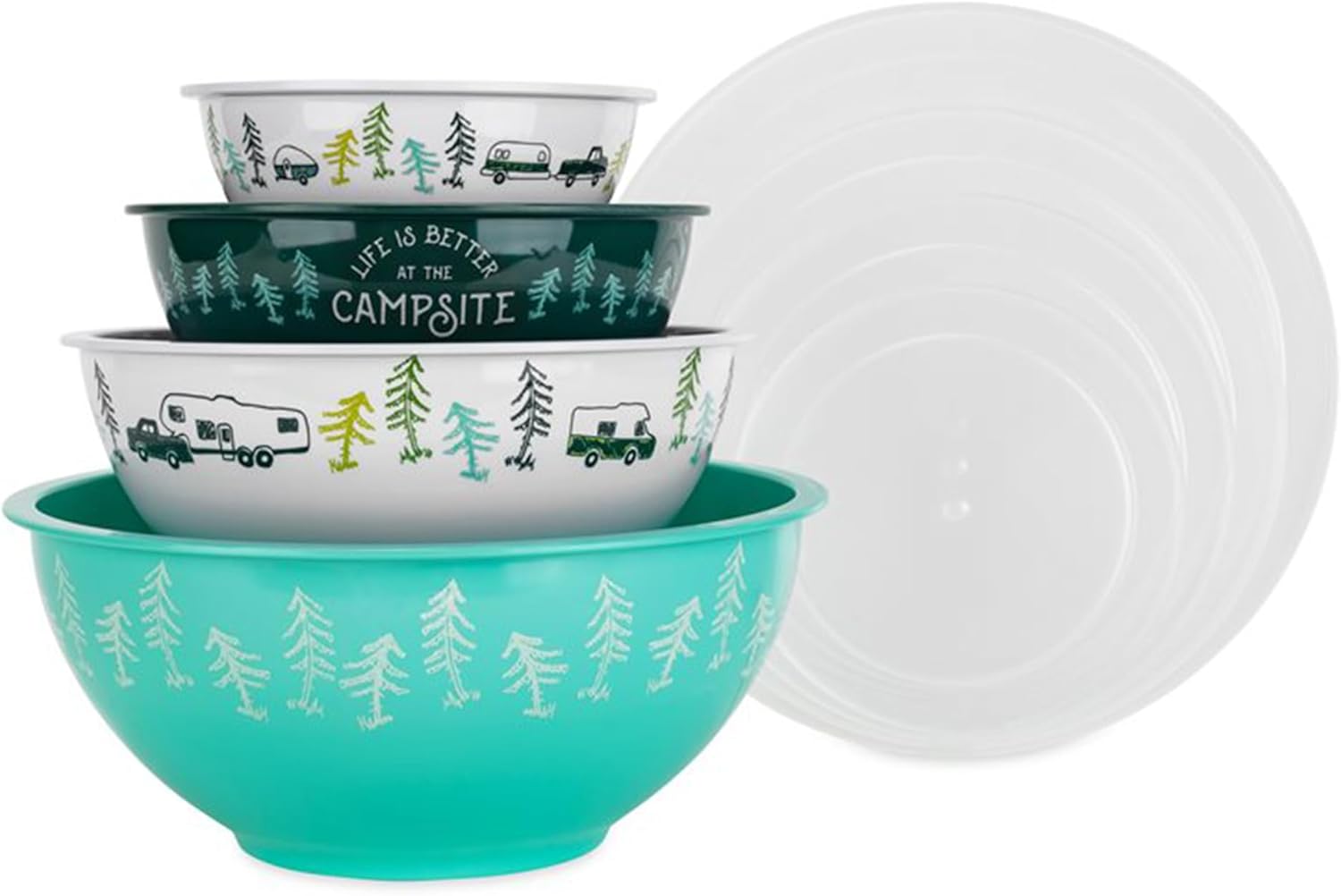 Camco Nesting Bowl Set with Lids - Features Life is Better at The Campsite Design - Camping Dishware Set Includes 4 Durable Melamine Bowls with 4 Plastic Lids - Camping Kitchen Essentials(53451)