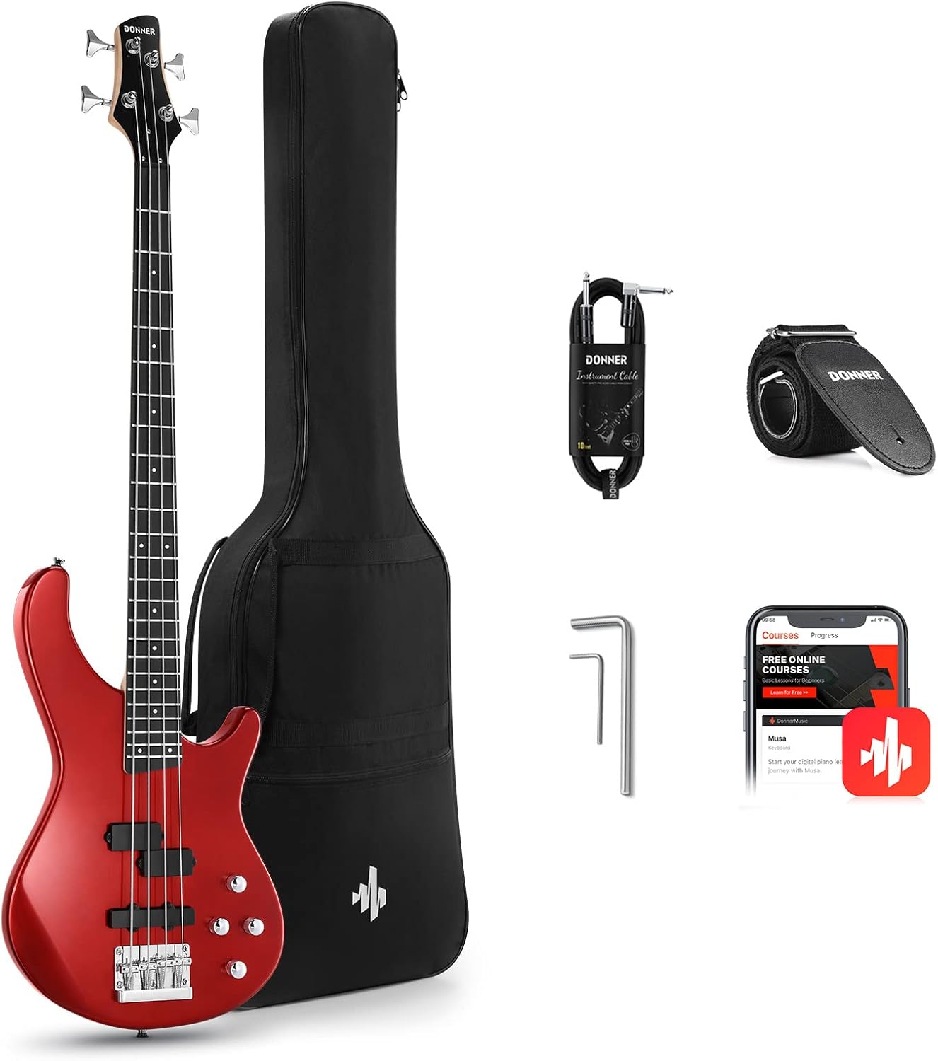 Donner Electric Bass Guitar 4 Strings Full-Size Standard Bass PJ-Style Electric Bass for Adults with Free Online Lesson,Gig Bag Guitar Strap and Guitar Cable Included, DPJ-100, Red