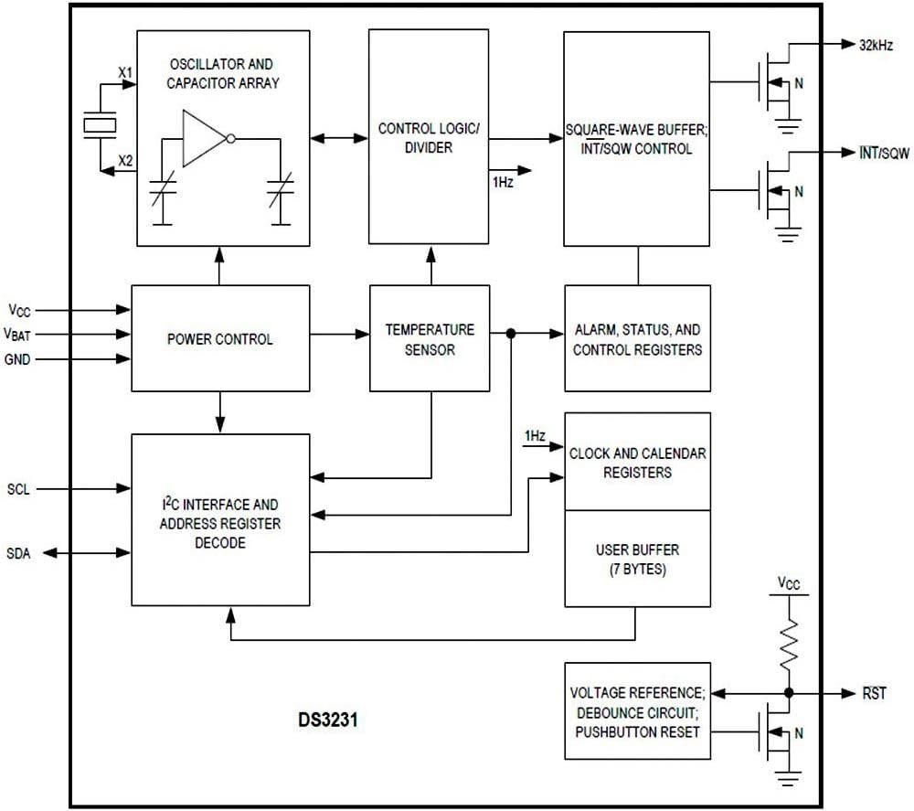 DS3231 16-pin memory chips - AT24C32 ,extremely accurate I2C real-time clock (RTC), with an integrated temperature-compensated crystal oscillator (TCXO) and crystal.