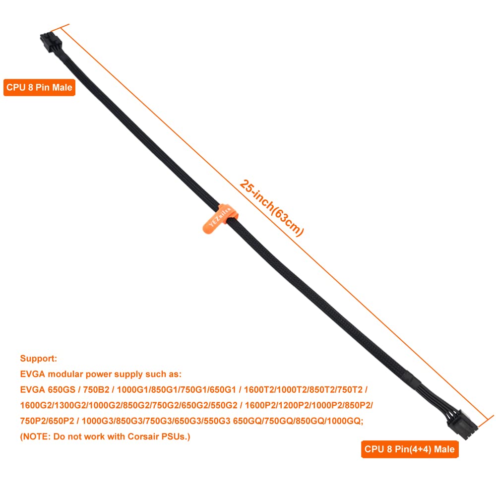 CPU Cable for EVGA PSUs, 8 Pin to 8 Pin (4+4 Detachable) Male EPS-12V Motherboard Power Adapter Sleeved 25-Inch (63cm)