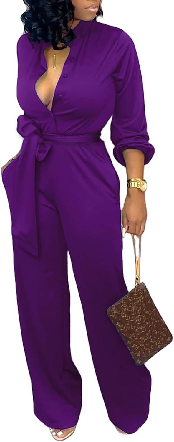 SxClub Jumpsuits for Women Formal Sexy Elegant Long Straight Pants Busineess Party Jumpsuit with Belt Pockets