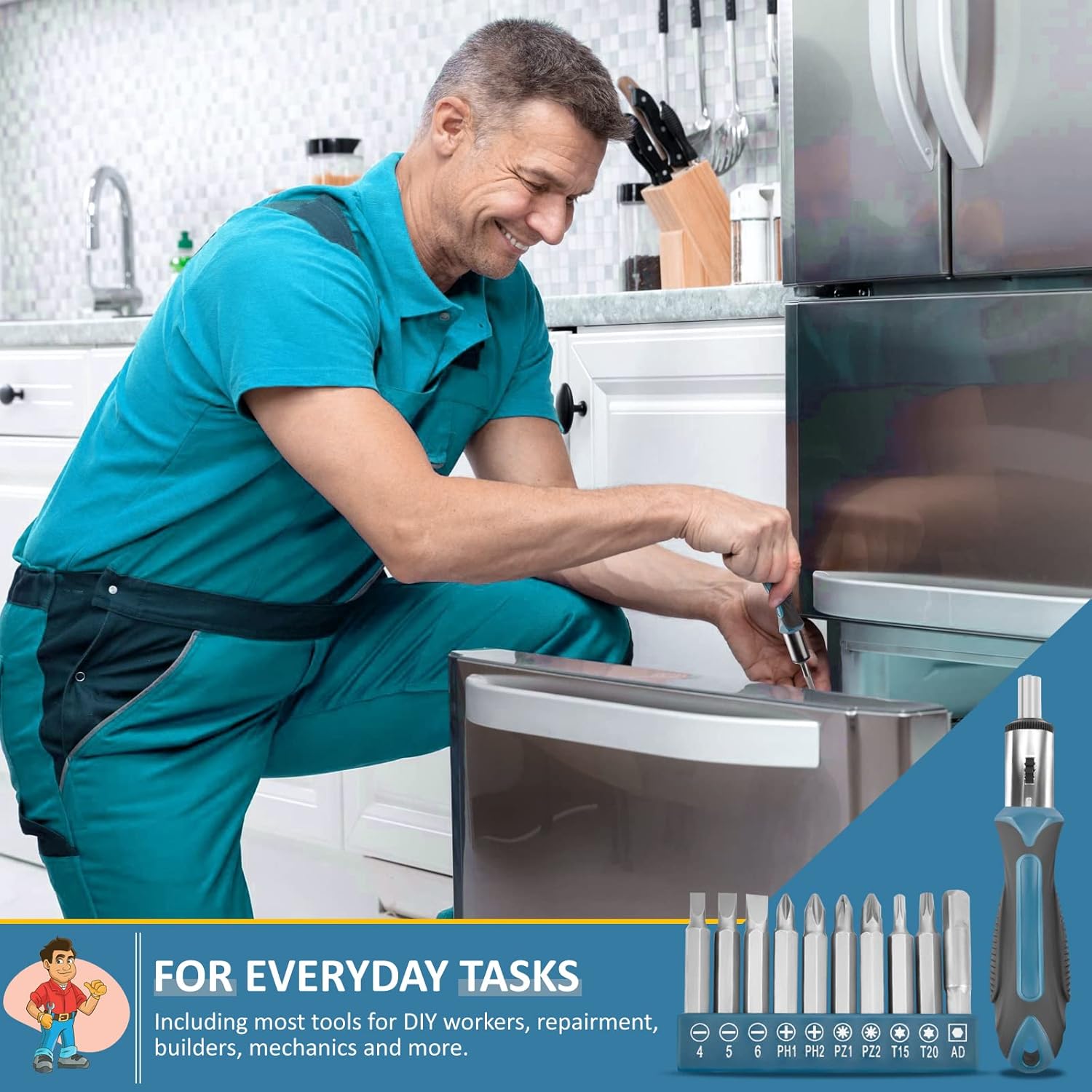 【Contain Basic Hand Home Rrepair Tool Set】Sundpey 148pcs homeowner portable travel tool set includes screwdriver bits,voltage tester, slotted screwdriver set, phillips screwdriver set, 10ft tape measure , water pump pliers, 8″ adjustable wrench, 6″ wire pliers, 6″ needle nose pliers etc for regular house indoor/outdoor maintenance.