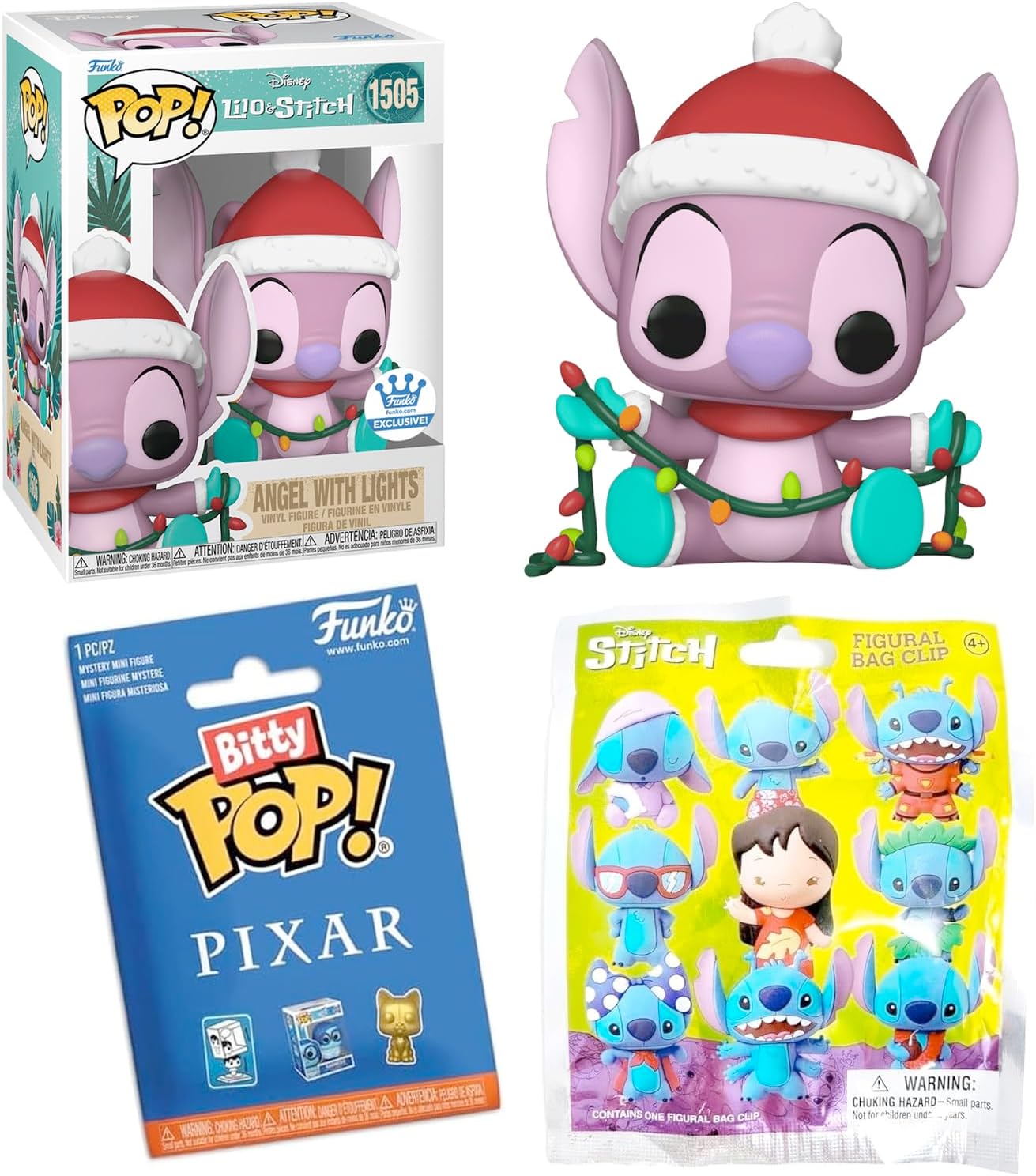 Conjunto de Figuras Divertidas de Disney -----Pop! Ángel con Luces Exclusivo #1505 Animación - Entra en el espíritu de las fiestas con este exclusivo Pop! Ángel! ¡Este adorable alienígena está ansioso por colgar las luces y reunirse con su ohana! + ----------- Colgador de Bolsos de Bolsa Ciega Stitch Sumérgete en el mundo de Lilo + Stitch con estas figuras coleccionables de espuma 3D! Tu experimento alienígena favorito ha causado algún problema como la Lilo +------------ historias y personajes, mini Bitty Pop! Pixar Bolsa Ciega Up, Héroe 6, Wall-E, Monsters Inc. y más