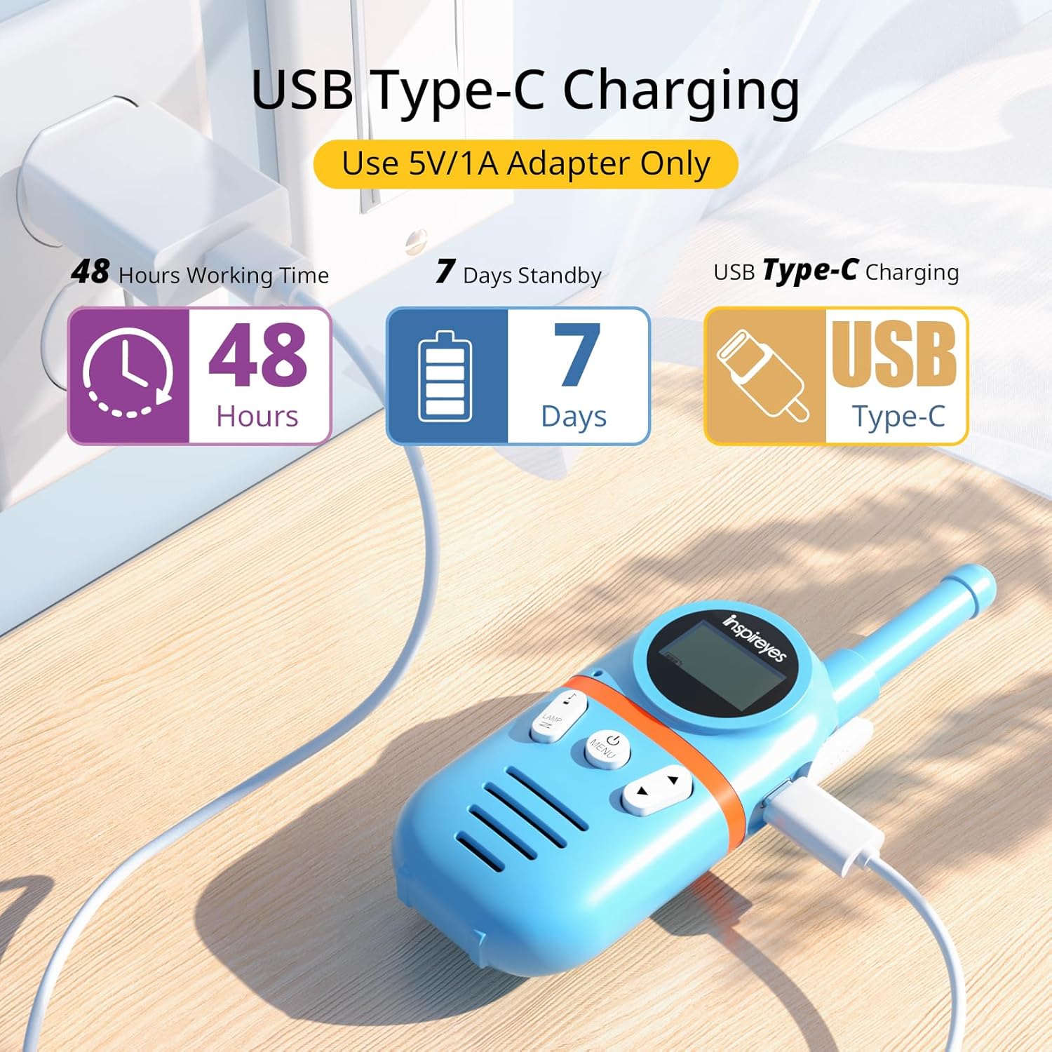 Inspireyes rechargeable kids walkie talkies are rechargeable and long lasting, featuring an upgraded built-in lithium polymer battery. There is no need to buy extra AAA batteries. Kids can enjoy up to 48 hours of playtime and 7 days of standby on a single charge.