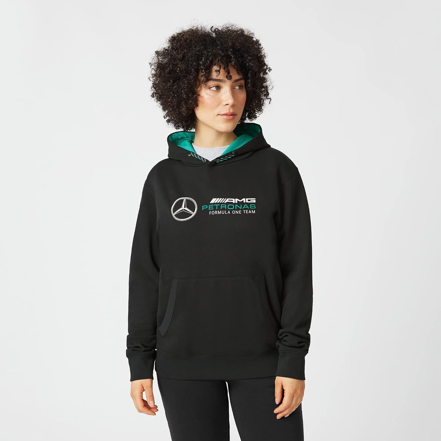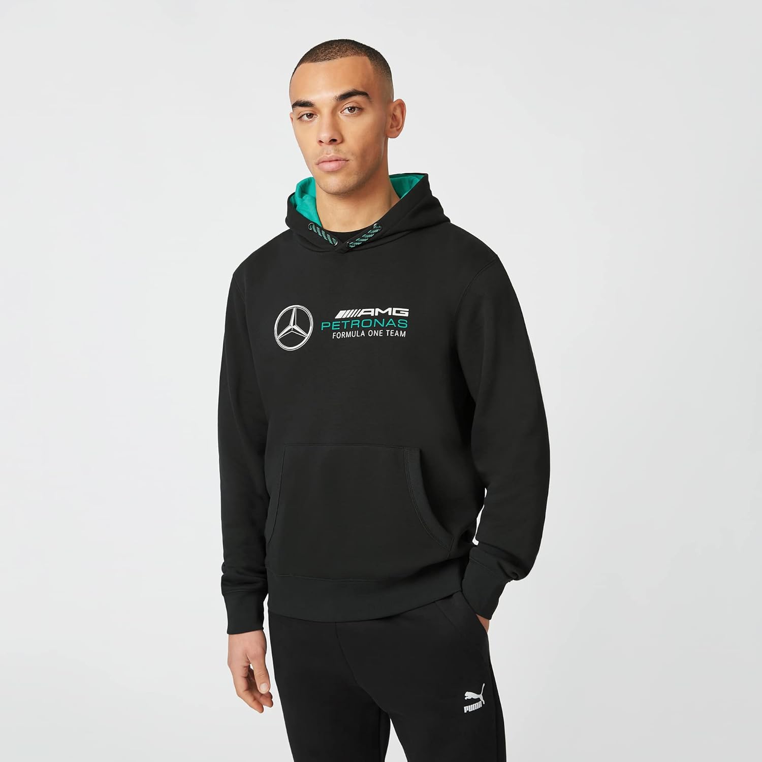 Licensed Mercedes-AMG PETRONAS F1 Logo Hoodie, part of the official merchandise collection on CMC Motorsports. With a roster of former world champions including Michael Schumacher and Nico Rosberg, the 2022 'Silver Arrows' driver line up consists of seven-time World Champion Lewis Hamilton and young star George Russell, both with their own bespoke merchandise collections available to shop now. Material: 80% Organic Cotton / 20% Polyester Printed team logo on chest Kangaroo pocket Secondary fixed snap button on hood Fixed drawcord on hood Ribbed hem and cuffs