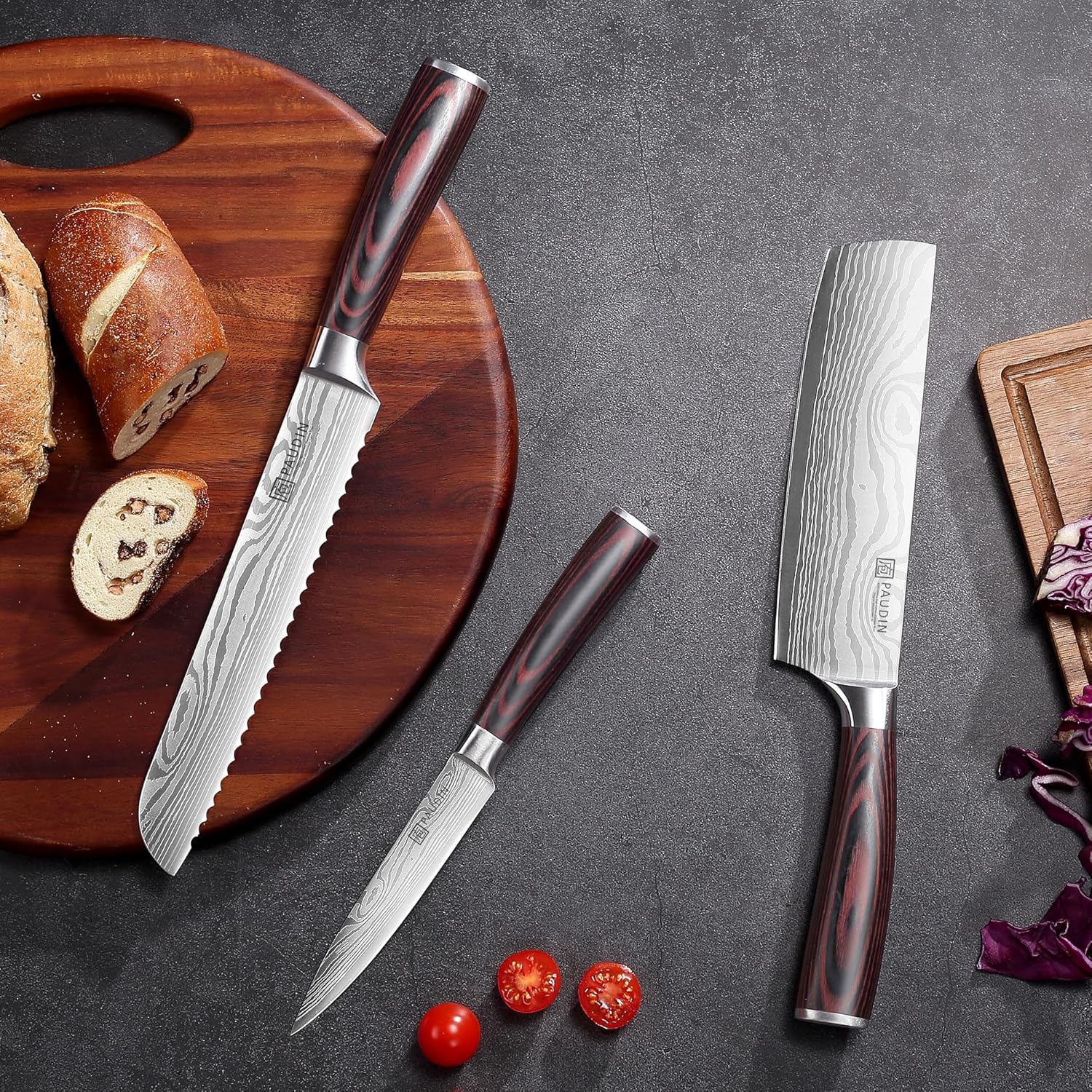 【Ideal Sharp Knife Set with Warranty】Lightweight and shiny, laser-etched pattern blade and a wood-grain handle, this cooking knife set is an attractive and practical gift for parents, friends, and neighbors. CUSTOMER FIRST! LIFETIME WARRANTY! PLEASE! Any questions about PAUDIN kitchen knives, please feel free to contact us to resolve!
