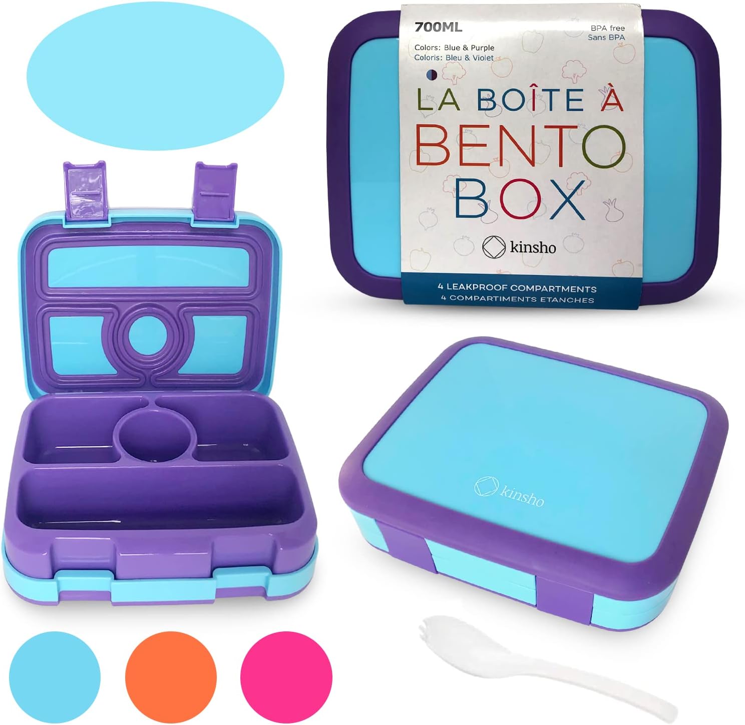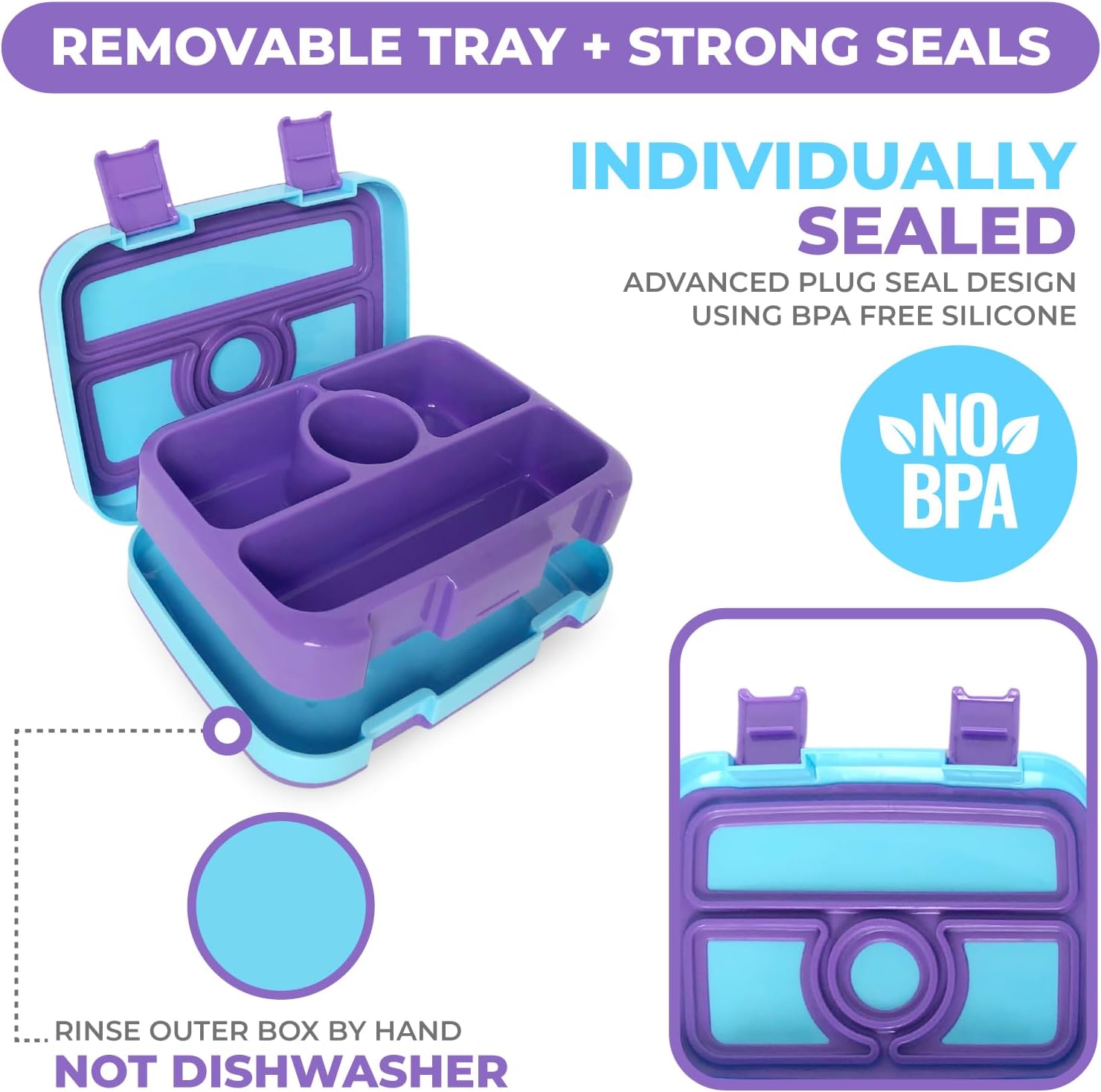 kinsho Bento Lunch Box for Kids Toddlers, 4 Portion Sections Secure Lid, Microwave Safe BPA Free Removable Tray, Pre-School Kid Daycare Lunches Snack Container Ages 3 to 5 Blue Purple