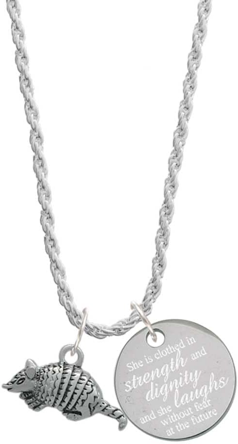 Imitation Rhodium Plated Small Armadillo She is Clothed in Strength and Dignity Charm Necklace, 20"+3". Charm size is approx. 0.46 x 0.74 x 0.1 inches (HxWxD) including loop. Necklaces come with Lobster Claw Clasp and 3 inch extender chain. 2mm Interlocking Rope Necklace Chain is adjustable from 20-23 inches in length. 19.55 mm Stainless Steel Disc is engraved with She is clothed in strength and dignity and she laughs without fear of the future. Inspirational Christian scripture from Proverbs 31:25. PLEASE NOTE: Our products are not intended for individuals 14 years and younger.