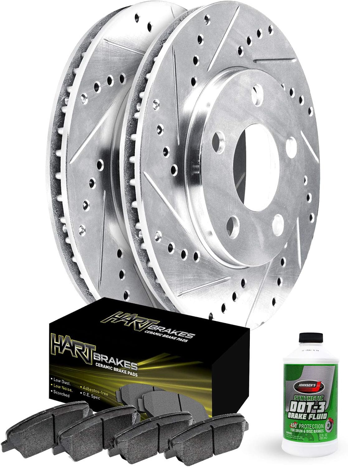 Front Brake Kit Replacement: Includes (2) Hart Brakes Front Drilled Slotted Brake Rotors with (4) Ceramic Brake Pads for improved braking performance