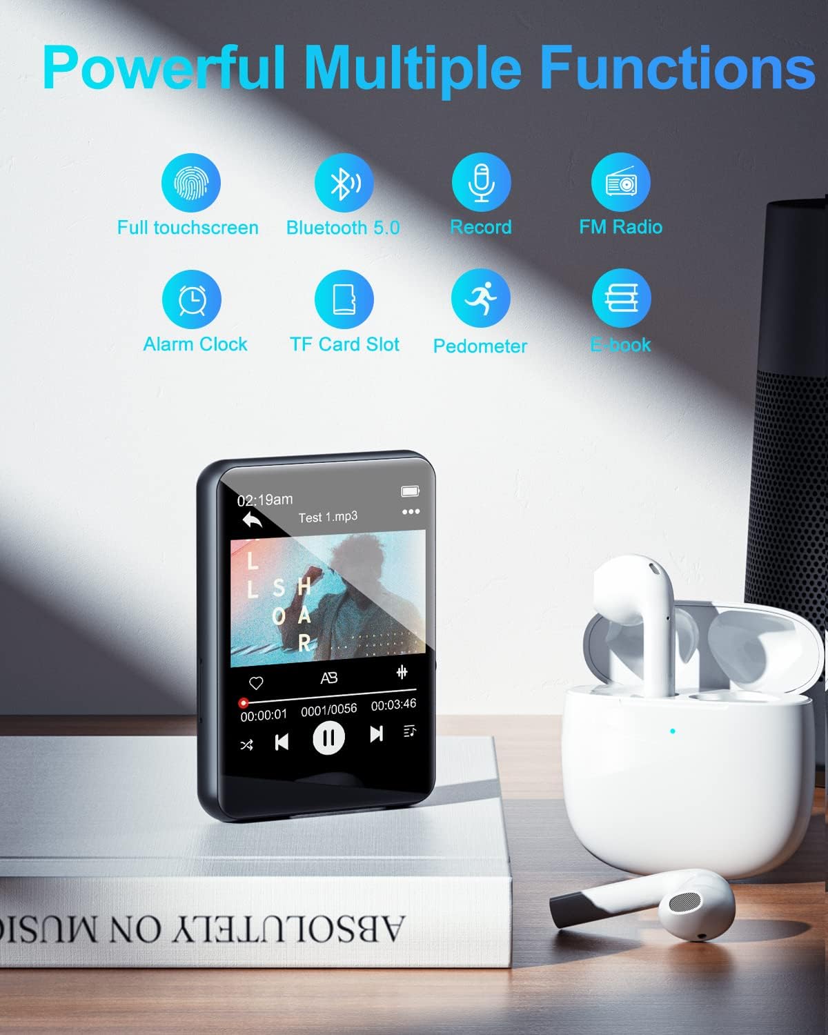 Reproductor Mp3 de 64GB con Bluetooth, Pantalla Táctil Completa de 2.4 Pulgadas Reproductor MP3 y MP4 con Altavoz HD Integrado, Radio FM, Grabadora de Voz, Diseño Mini Reproductor de Música Deportiva con Soporte de Expansión (128GB) Negro