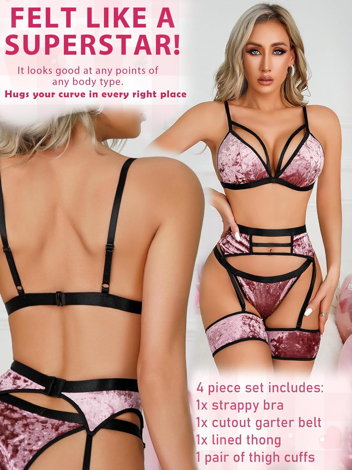 popiv Women's Sexy Lingerie Set with Garter Belt Matching Bra and Panty Lingeries Sets 4 Piece