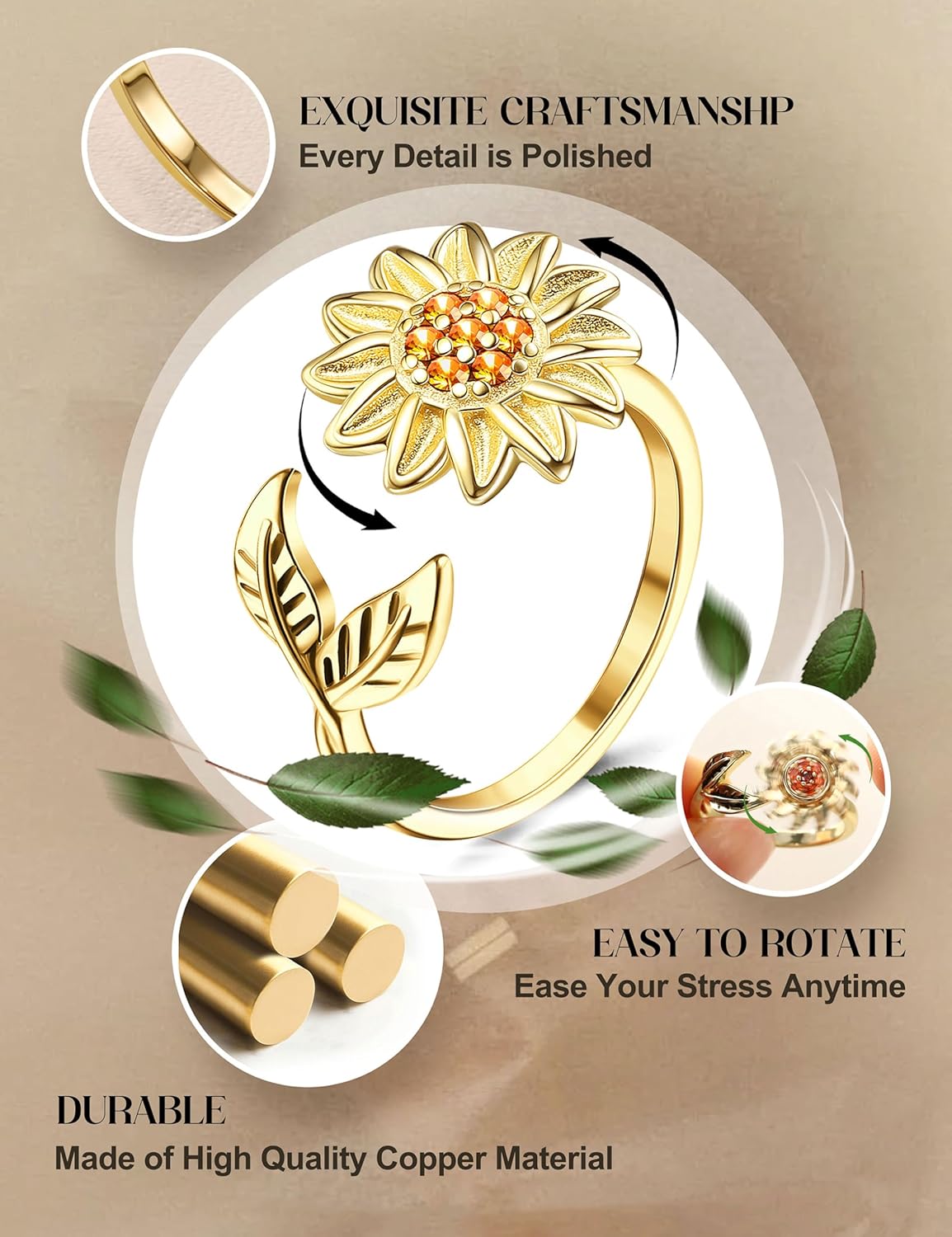 FIBO STEEL 9 Pcs Fidget Anxiety Rings for Women Men Spinner Rings for Anxiety Relieving Stress Open CZ Flower Moon Star Anti Rotatable Rings Adjustable