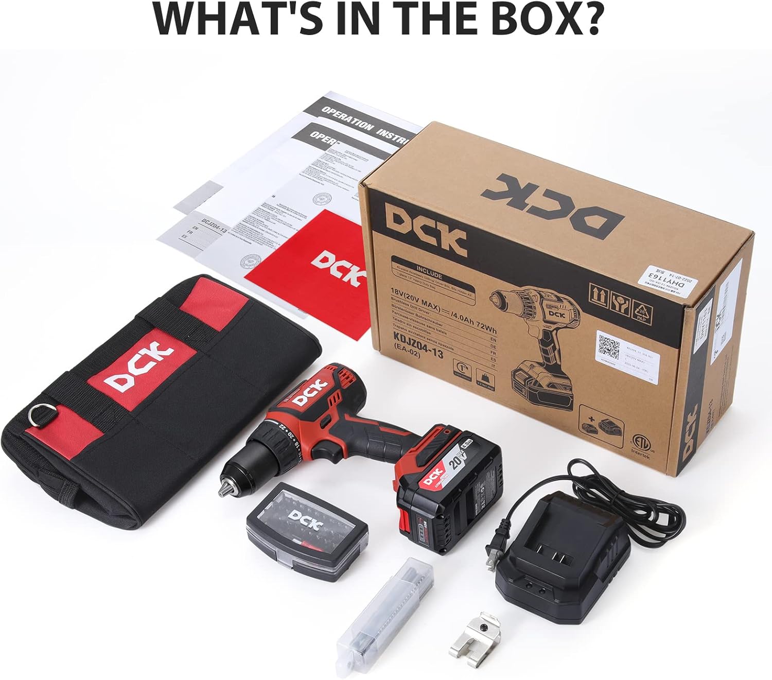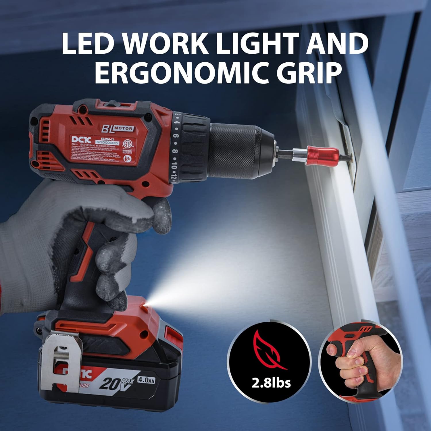 [Batería Duradero de 4.0Ah y Cargador] Su batería de 20V 4.0Ah es duradera, por lo que no tiene que preocuparse de quedarse sin energía en medio de un proyecto. El kit de taladros está equipado con un cargador de gran capacidad que extiende enormemente su tiempo de uso. Este taladro eléctrico también tiene un indicador de batería para recordarle el estado de la batería, haciendo su trabajo más eficiente y conveniente. La batería y el cargador son compatibles con herramientas DCK de 20V.