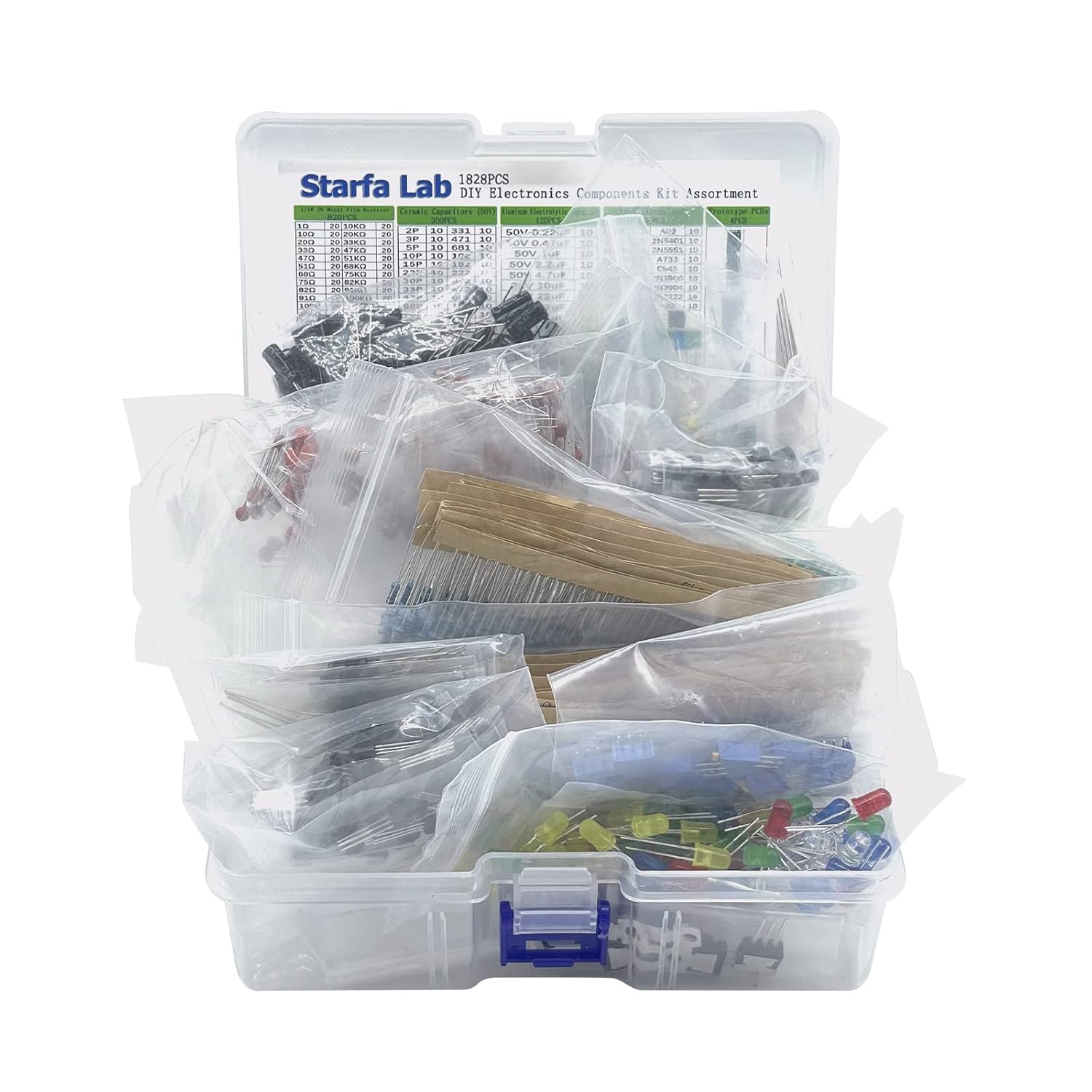 1828PCS DIY Electronics Components Kit Assortment for Arduino UNO MEGA2560 Raspberry Pi MCU, PCB, LED, Triode, Diodes, Capacitors, Potentiometer, Variable Resistors in a Clear Plastic Box