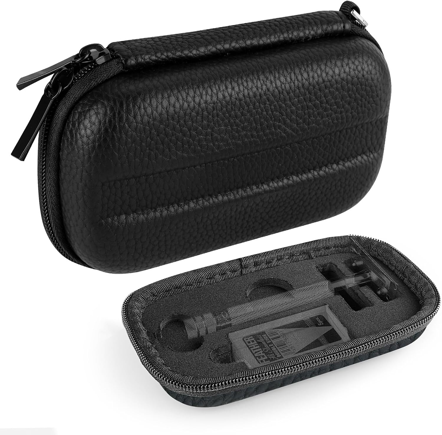 Razor travel case made of PU, EVA inner liner. Protects and stores long or short handled double edged safety razor.