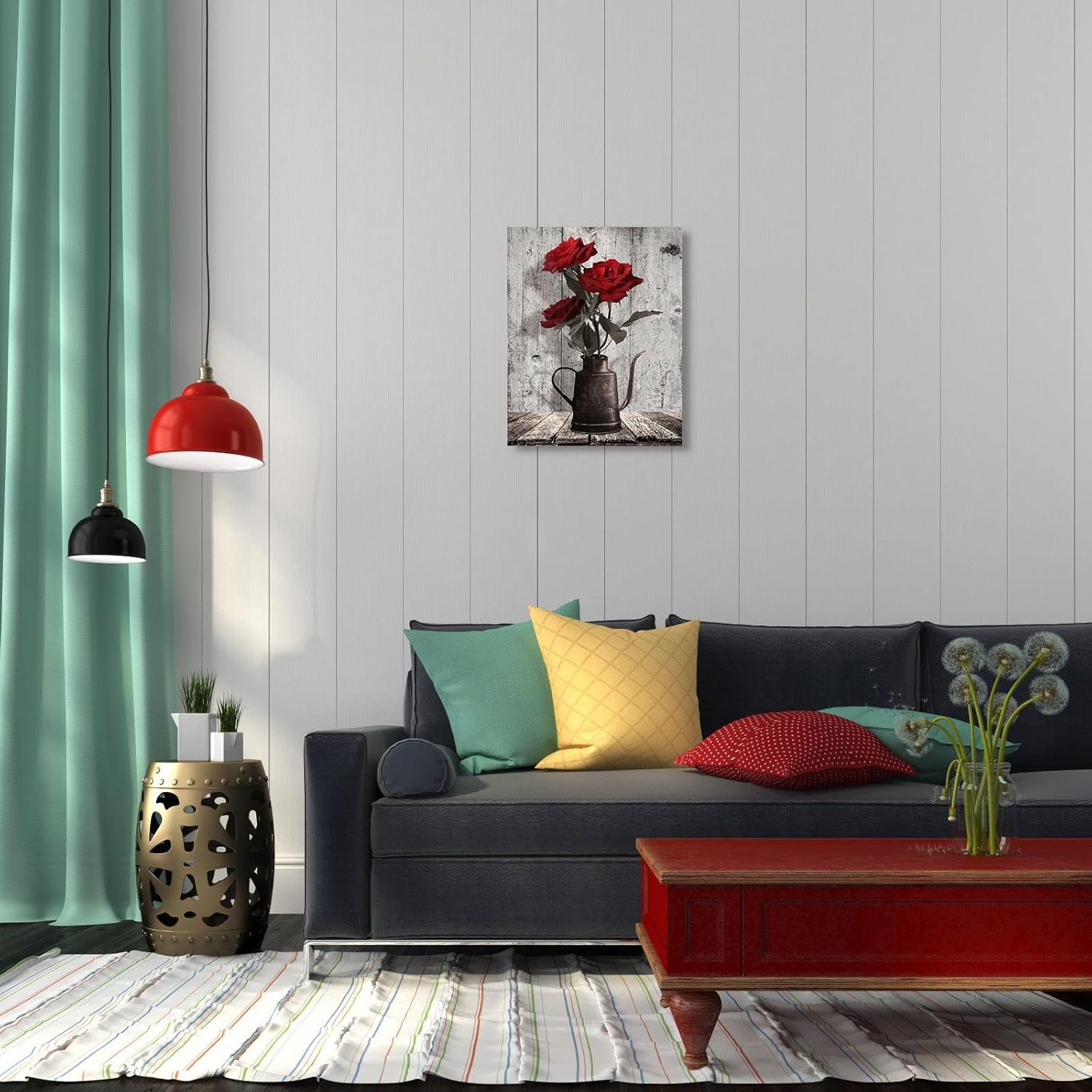 Original Design: A bouquet of red roses blooms in vintage kettle on wood panel. Vibrant red flowers collides with retro gray background in this wall art, generating a relaxing atmosphere to refresh your home