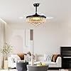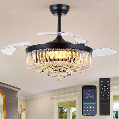 Asyko 48" Black Crystal Chandelier Ceiling Fans with Lights, Modern Retractable Blade Ceiling Fan Light with Remote and APP, Dimmable 3 Light Colors and Reversible Quiet DC Motor