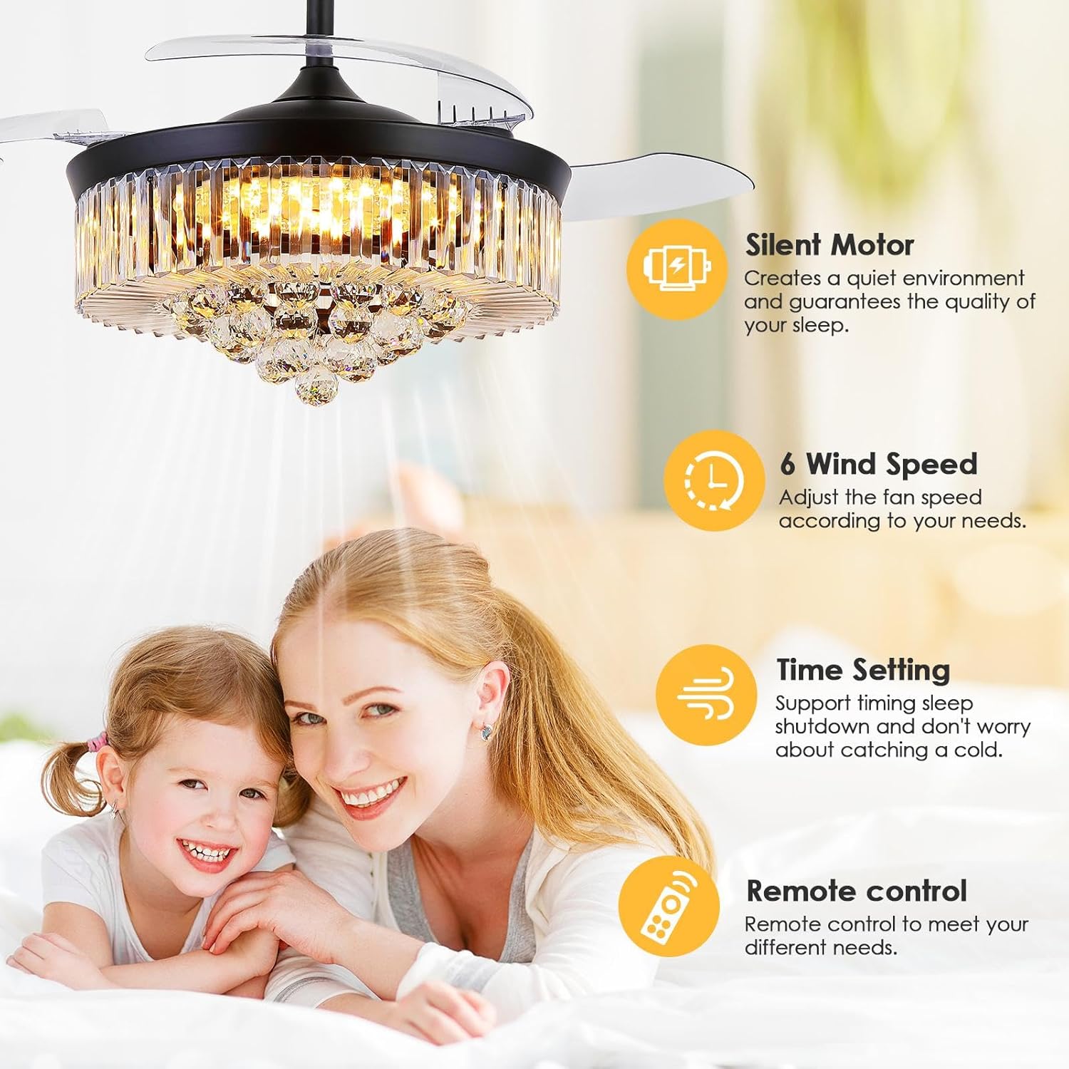 ✅【Luxury Crystal Ceiling Fan】:Black crystal ceiling fans adopt K9 crystals of high purity, clear and high refractive index; raised the level of home decoration.is a perfect combination of modern ceiling fan and elegant crystal chandelier,suitable for living room,bedroom,dining room,patio,office,kitchen etc