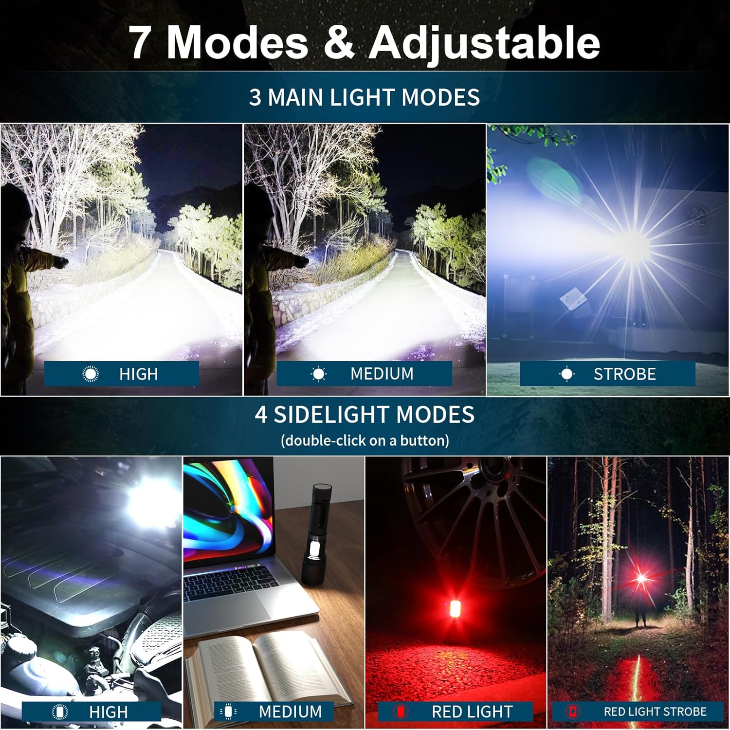 🔦 [Imán y 7 modos] Esta potente linterna tiene 3 luces principales: alta, media, estroboscópica y 4 luces laterales: luz estroboscópica blanco-roja cálida. La linterna magnética con una potente base magnética combinada con una luz en forma de mazorca deja las manos libres para hacer otras cosas por la noche. Ten en cuenta que la linterna más brillante está en modo de luz alta cada vez que se enciende, así que no la ilumine sobre tus gafas.