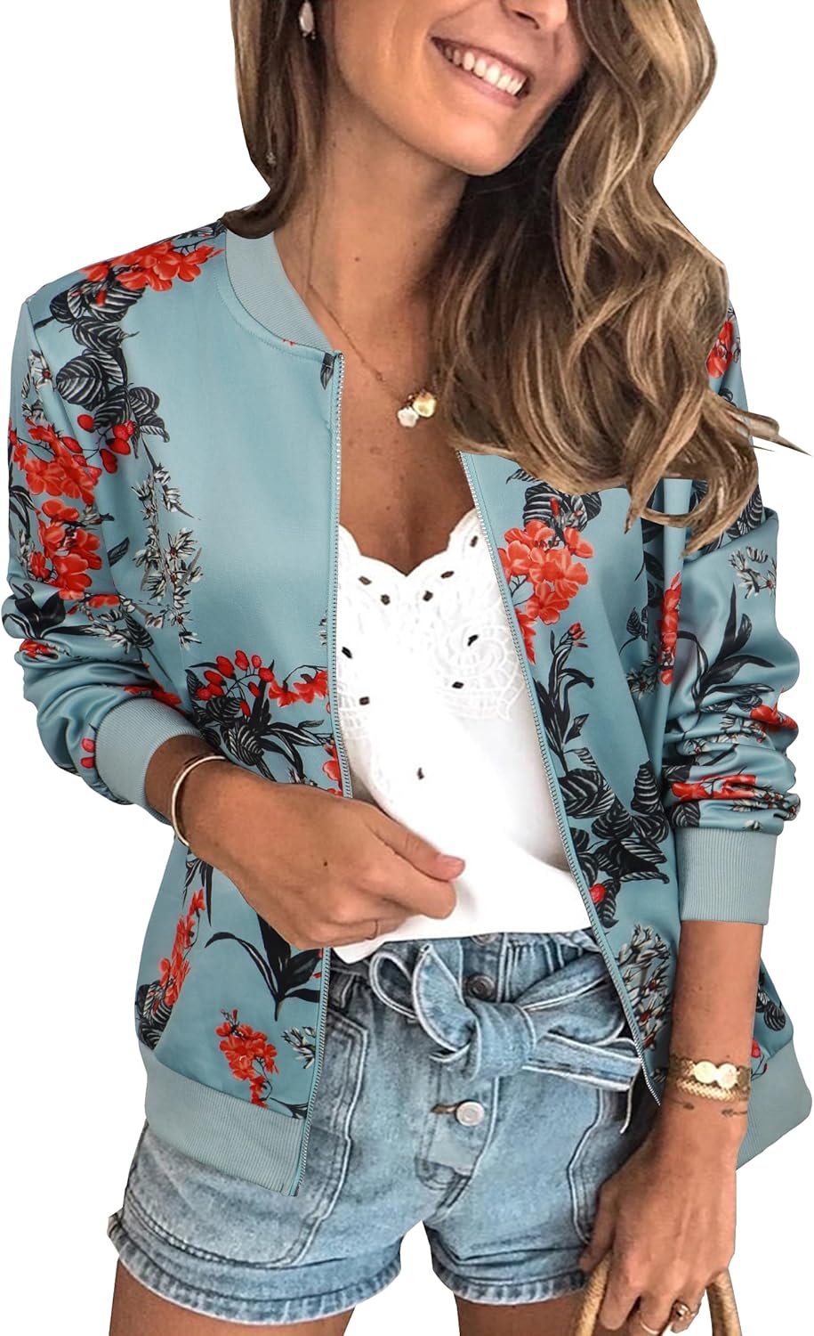 ECOWISH Women's Casual Floral Zip Up Bomber Jacket Coat Lightweight Short Camo No Lining Outwear Tops Windbreaker with Pocket