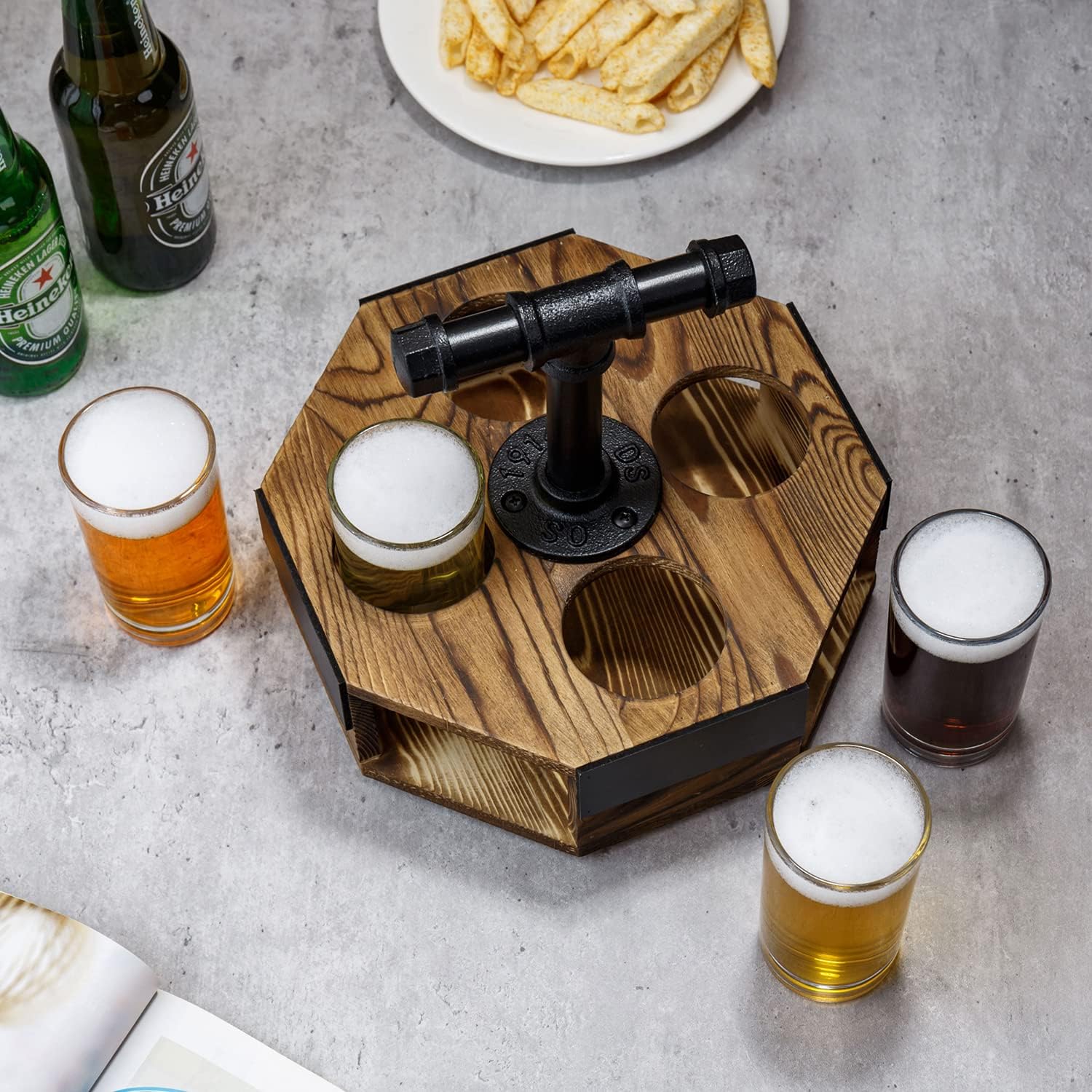 Rustic beer or whiskey tasting octagonal serving caddy with solid wood holding tray, industrial matte black metal pipe carrying handle and 4 sampler glasses, a stylish and fun way to enjoy and serve several different types and styles of beer or liquor at once
