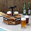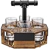 Rustic beer or whiskey tasting octagonal serving caddy with solid wood holding tray, industrial matte black metal pipe carrying handle and 4 sampler glasses, a stylish and fun way to enjoy and serve several different types and styles of beer or liquor at once