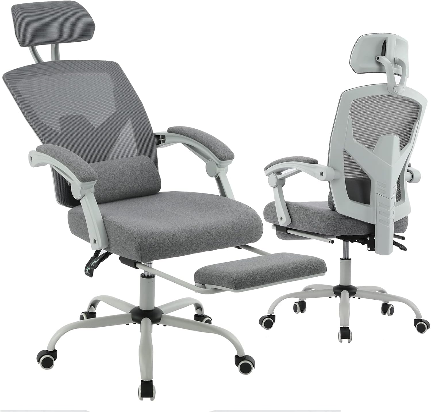 DUMOS Ergonomic Office Chair, Reclining High Back Mesh Computer Desk Swivel Rolling Home Task Chair with Lumbar Support Pillow, Adjustable Headrest, Retractable Footrest and Padded Armrests, Grey