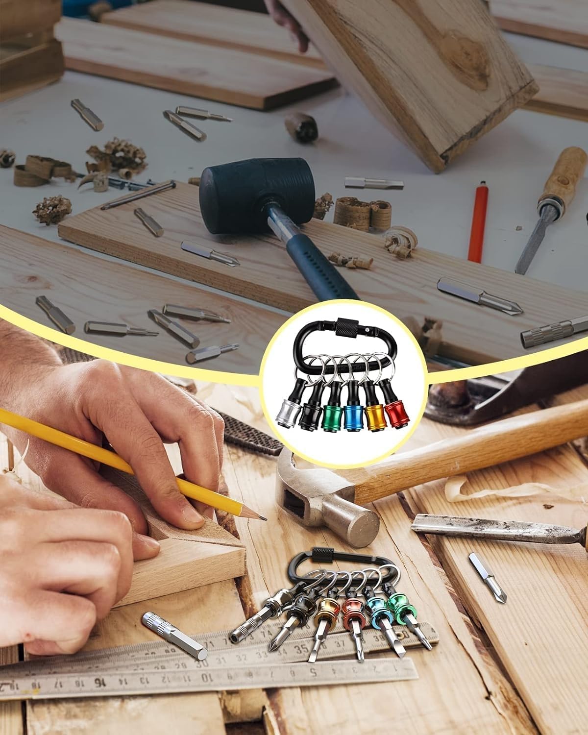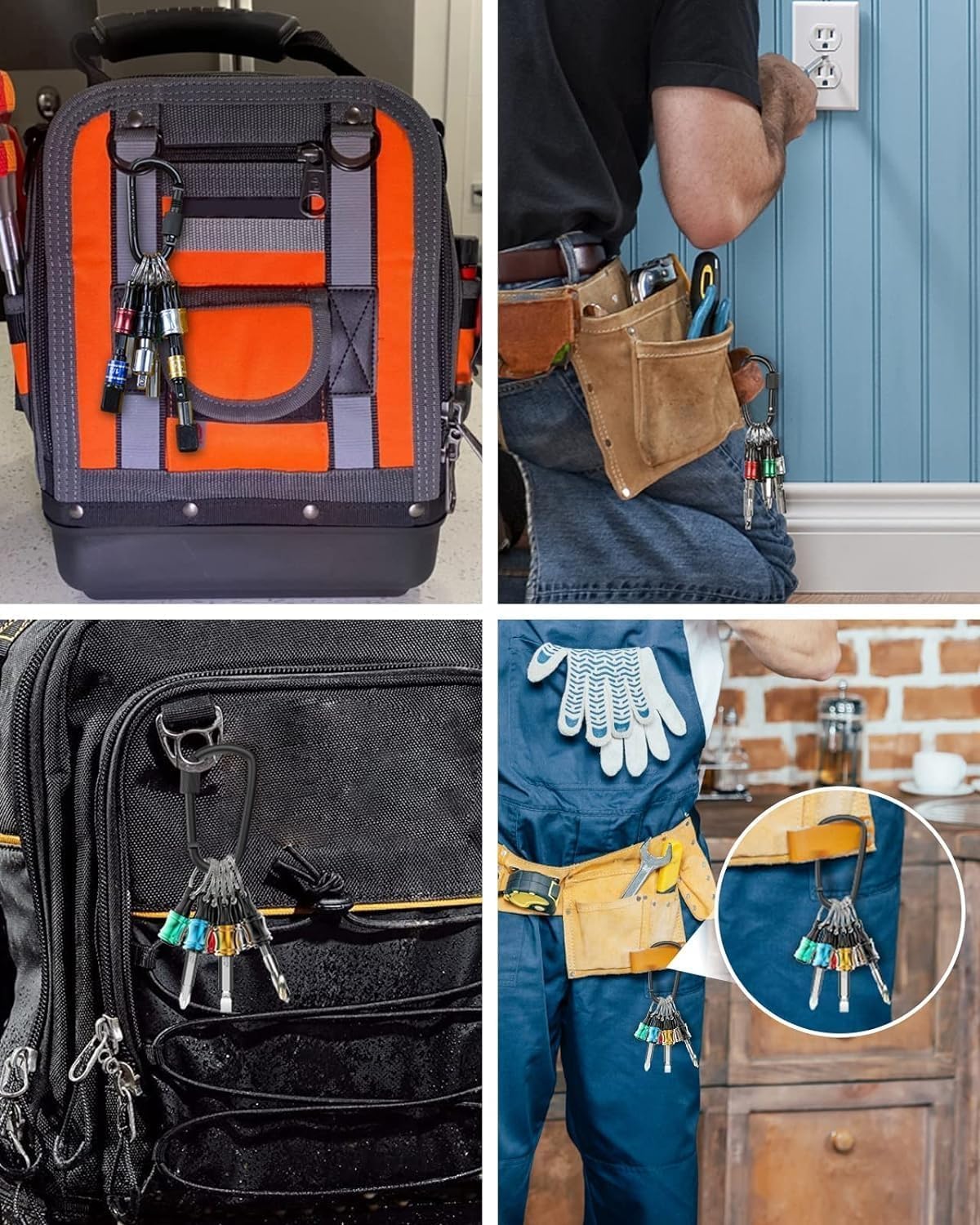Push to Unlock, Katerk 6pcs 1/4 inch Hex Shank Aluminum Alloy Screwdriver Bit Holder Light-Weight Quick-Change Extension Bar Keychain Drill Screw Adapter Portable, Black Carabiner, Tool Gifts for Men