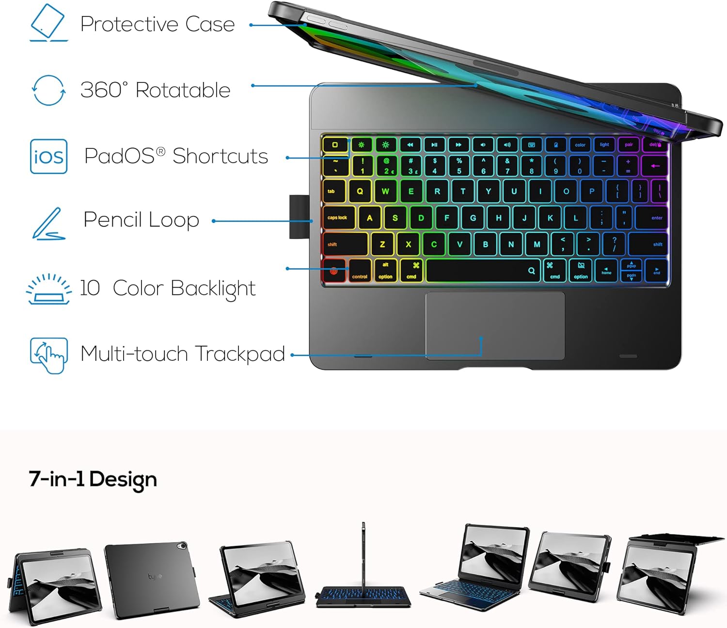 Illuminated Typing - Laptop-like keyboard case,accurately type on an illuminated keyboard with a full row of iPadOS shortcuts and laser-etched keys, and it allows an adjustable 11-color RGB LED backlight to shine through.