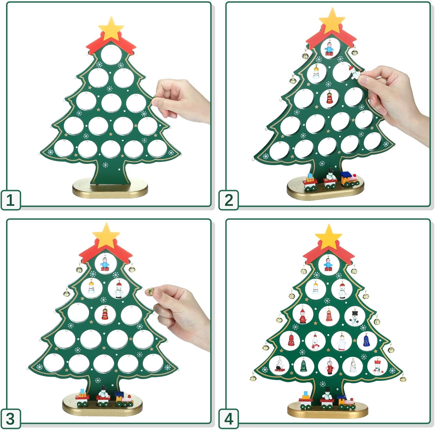 CALENDARIO DE CUENTA REGRESIVA DE NAVIDAD - Incluye 1 árbol de Navidad de madera con campanas de Navidad, tren de madera y adornos variados para el árbol de Navidad.