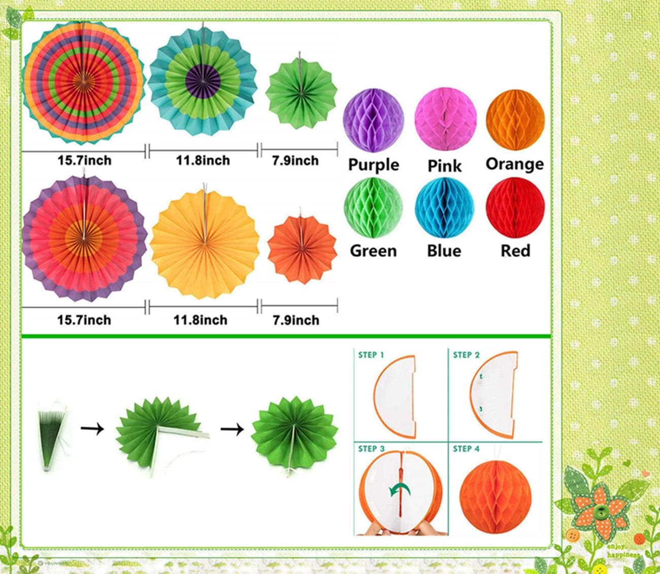 Complete Set: Includes 1 colorful triangle flag bunting, 1 happy birthday banner, 1 circle paper garland flag, 8 metallic swirls, 6 honeycomb balls, and 6 confetti garlands for assembly.