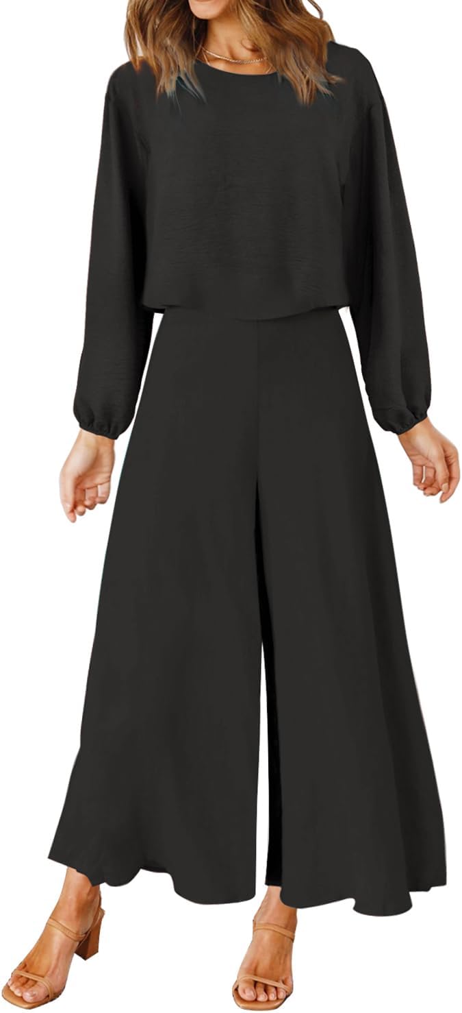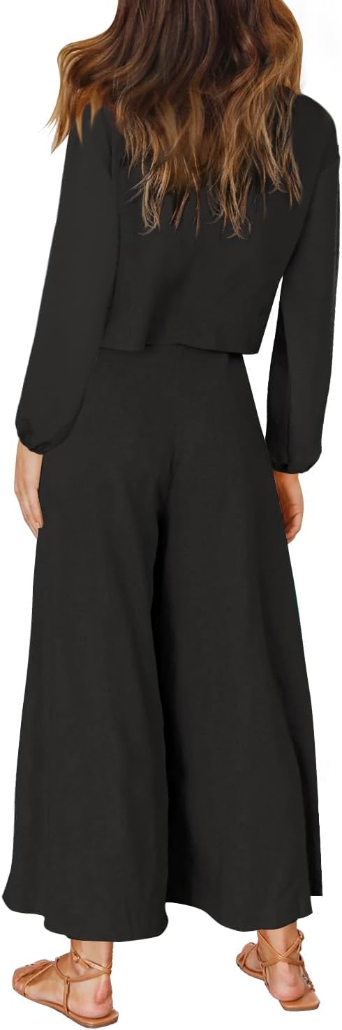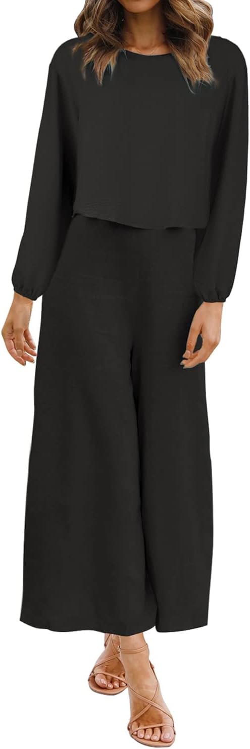ROYLAMP Women's Summer 2 Piece Outfits Round Neck Crop Basic Top Cropped Wide Leg Pants Set Jumpsuits