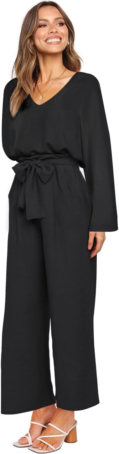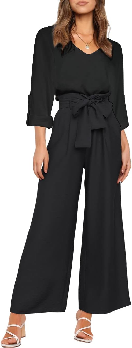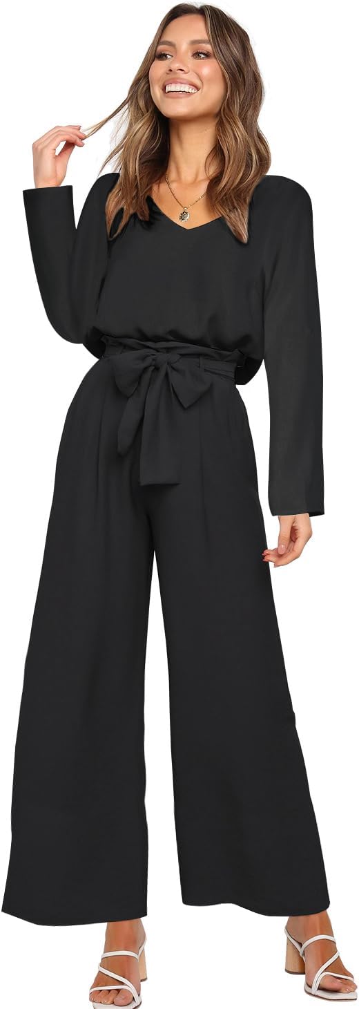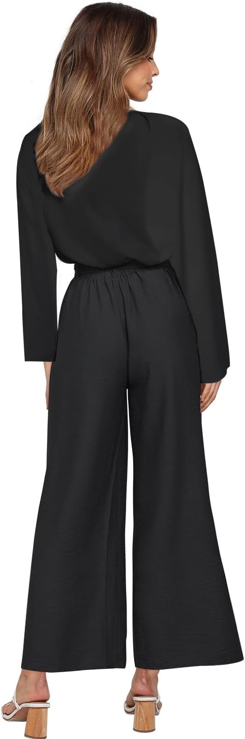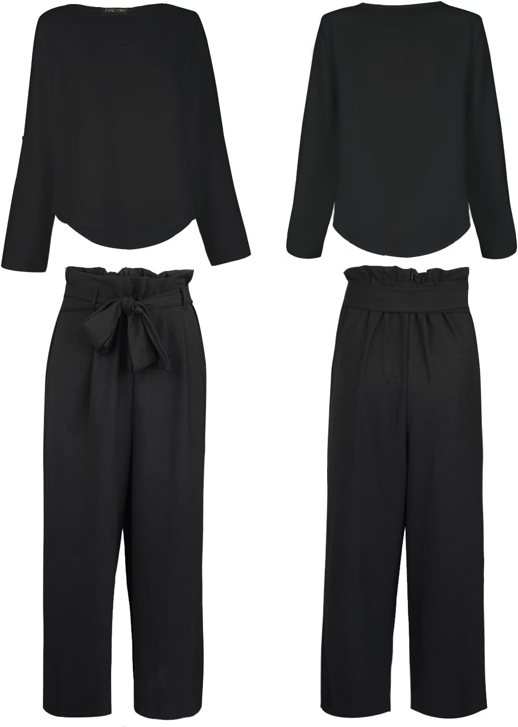 FANCYINN Womens 2 Piece Outfit Set V Neck Long Sleeves Tops High Waisted Paper Bag Pants with Belt
