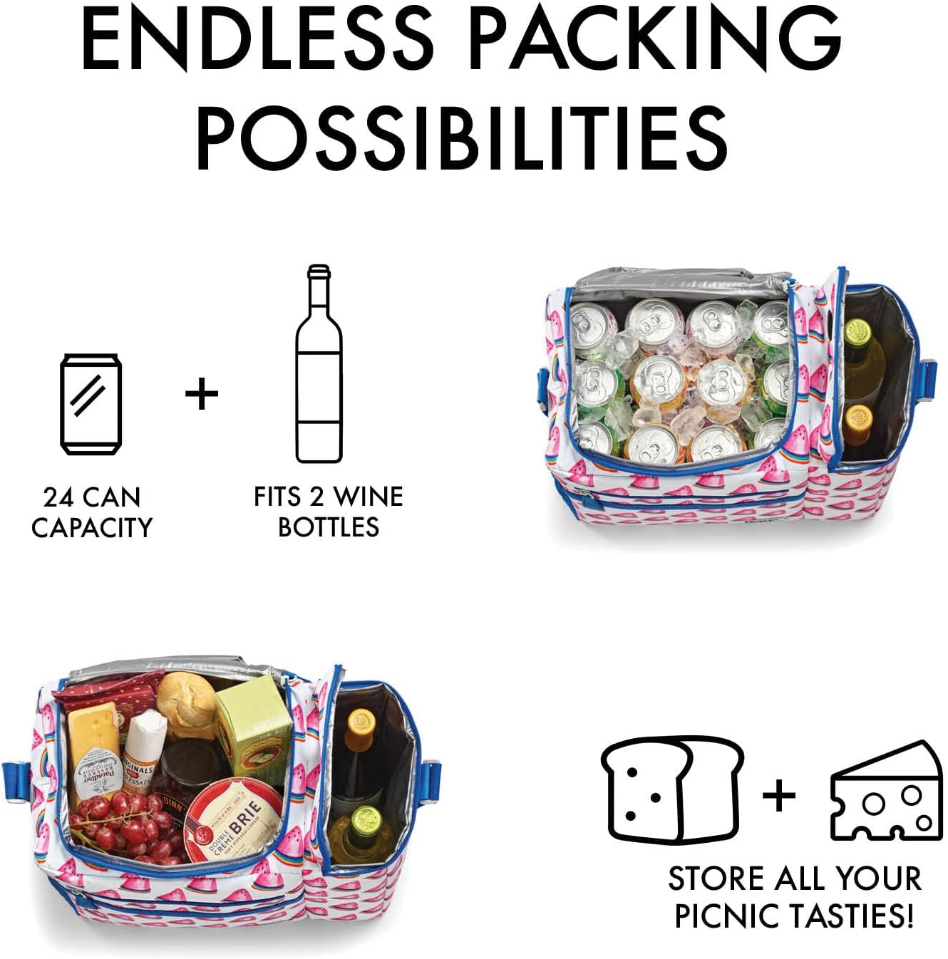 STAYS COOL - 3 layer thermal insulation ensures prolonged freshness, complemented by a leak-proof interior for easy cleaning. Our slotted compartment holds wine bottles upright when traveling.