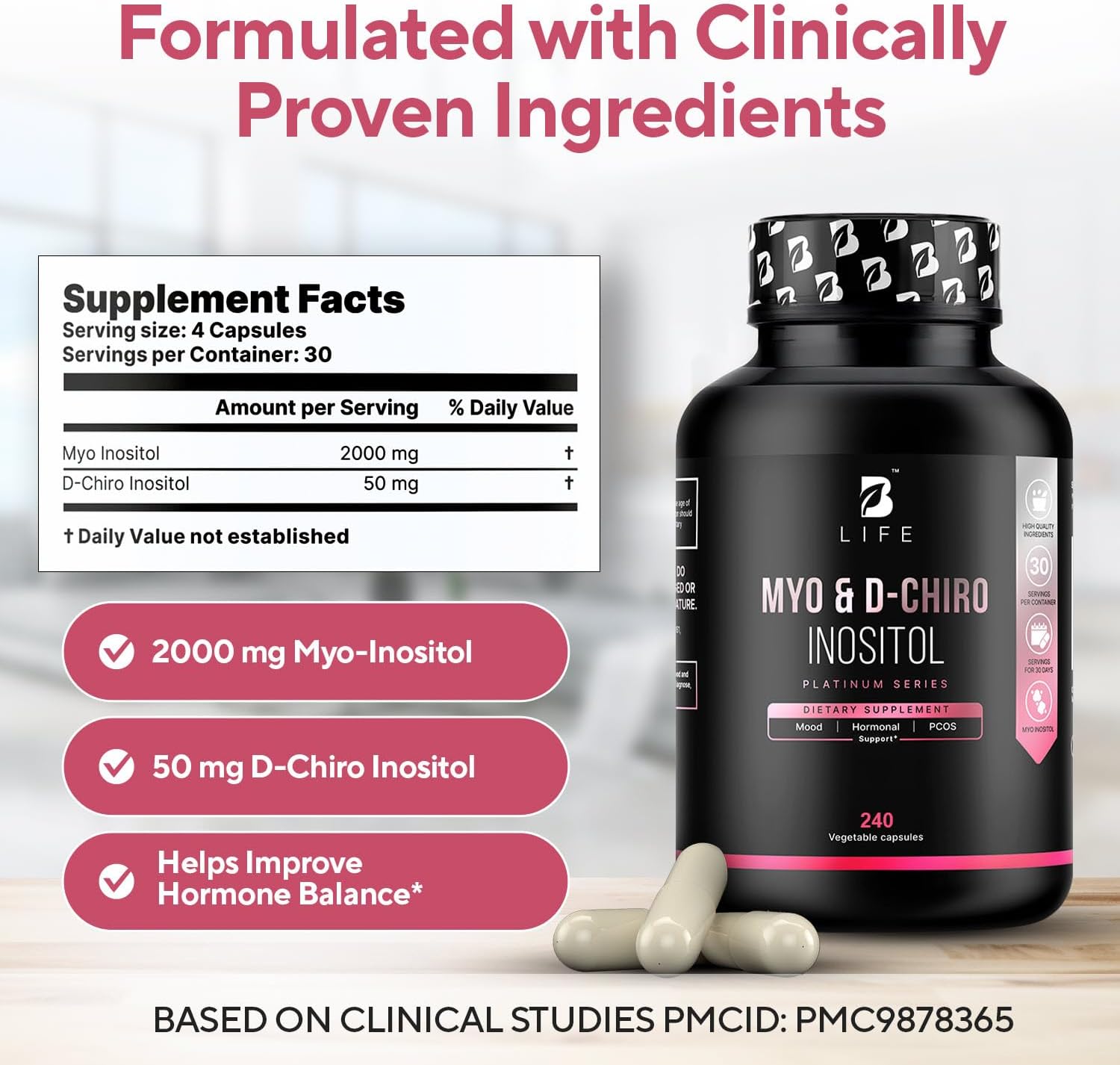 Myo-Inositol & D-Chiro Inositol por B Life - 240 Cápsulas | Hecho en EE. UU. | Relación 40:1 | Suplemento de Vitamina B8